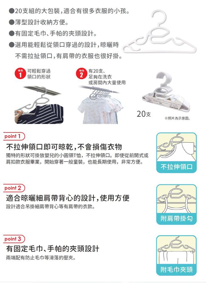●20支量販包,適合用於不知不覺就變多的兒童衣物。