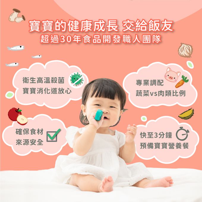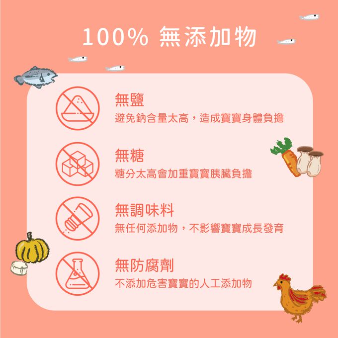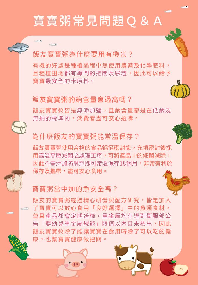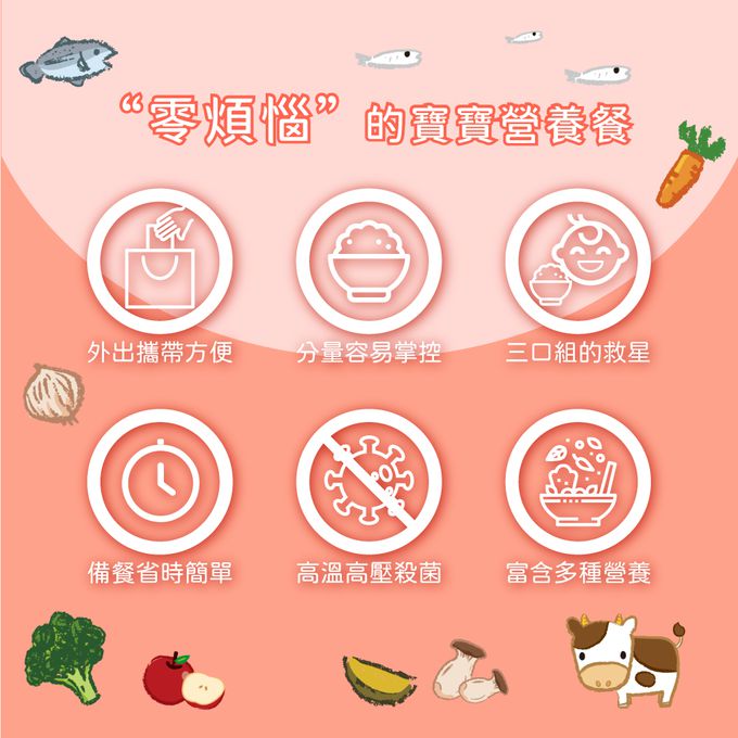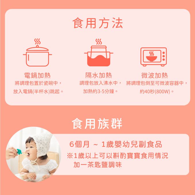 成分:< 滿分鮭魚寶寶粥 > 成分:水、白米、鮭魚、紅蘿蔔、玉米、洋蔥、青花菜 < 番茄小牛寶寶粥 > 成分:水、白米、番茄、牛肉、紅蘿蔔、洋蔥 < 蘋果小豬寶寶粥 > 成分:水、白米、酵素豬、紅蘿蔔、蘋果、青花菜 < 彩椒菇菇寶寶粥 > 成分:水、白米、南瓜、彩椒(甜椒)、杏鮑菇 < 南瓜小雞寶寶粥 > 成分:水、白米、雞肉、南瓜、山藥、青花菜 < 貝貝吻魚寶寶粥 > 成分:水、白米、紅蘿蔔、洋蔥、青花菜、吻仔魚、海灣貝柱
