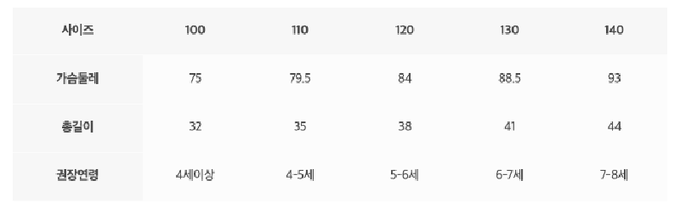 尺寸表由上而下為:尺寸、胸圍、總長、建議年齡