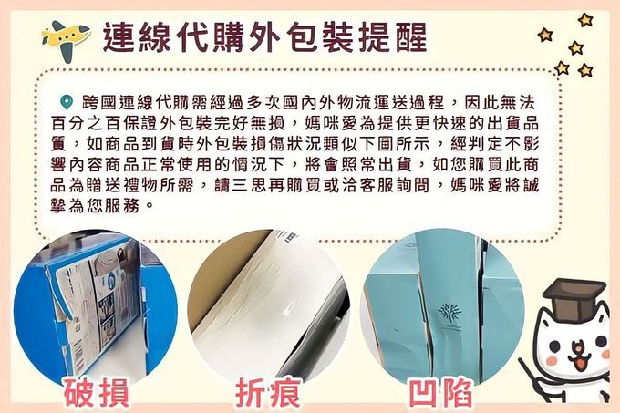 • 預購商品:預購為海外同步代購,遇缺貨即會通知媽咪並協助取消退款事宜。