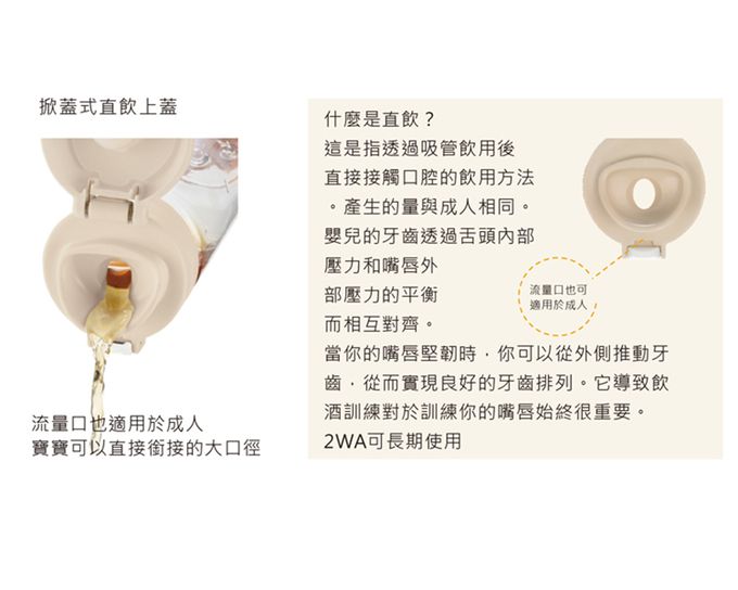 • 注意事項:適用年龄:1歲半以上 吸口、墊圈 材質:矽膠 耐熱溫度:140℃ 耐冷溫度:-20℃ 頂蓋 材質:聚丙烯 耐熱溫度:120℃ 耐冷溫度:-20℃ 蓋子、按鈕(軸銷、彈簧) 材質:聚丙烯、304不鏽鋼 耐熱溫度:120℃ 耐冷溫度:-20℃ 杯體 材質:改質PCT 耐熱溫度:110℃ 耐冷溫度:-20℃ 產地:中國 食品業登錄字號:A-190435744-00000-4 【注意事項】 ● 使用前,請先閱讀水杯附屬使用説明書後正確使用。 ● 為孩子的安全和健康著想,要在成年人指導下使用。 ● 長久吮吸液體會腐損牙齒。 ● 餵食前需要注意飲料溫度,吸管及水杯的所有組件,不使用時放置在嬰孩不能接觸的地方。 ● 請勿放置於火源旁邊。 ● 請確實蓋緊蓋子和頂蓋。 ● 使用硬毛刷或去污粉刷洗,將可能導致刮傷、掉色。