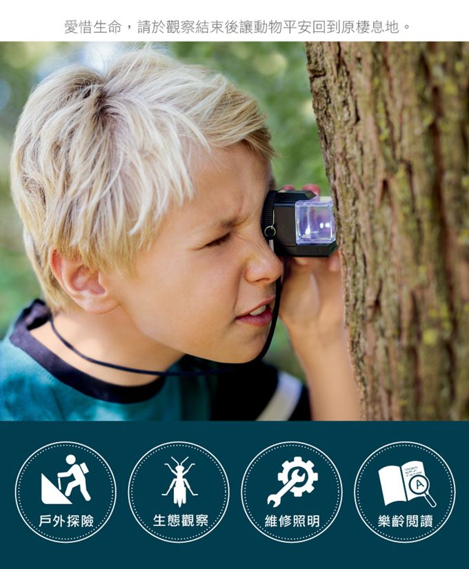 注意事項:▪本產品不適合三歲以下兒童使用 ▪塑膠製品請勿重摔 ▪請愛惜生命,於觀察結束後讓動物平安回到原棲息地
