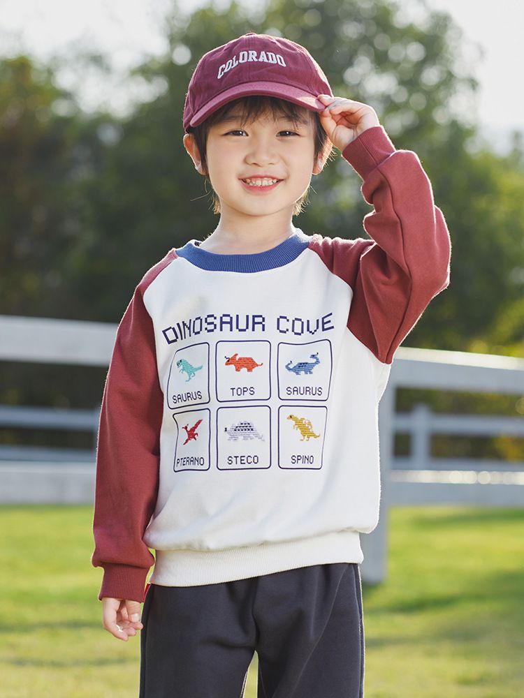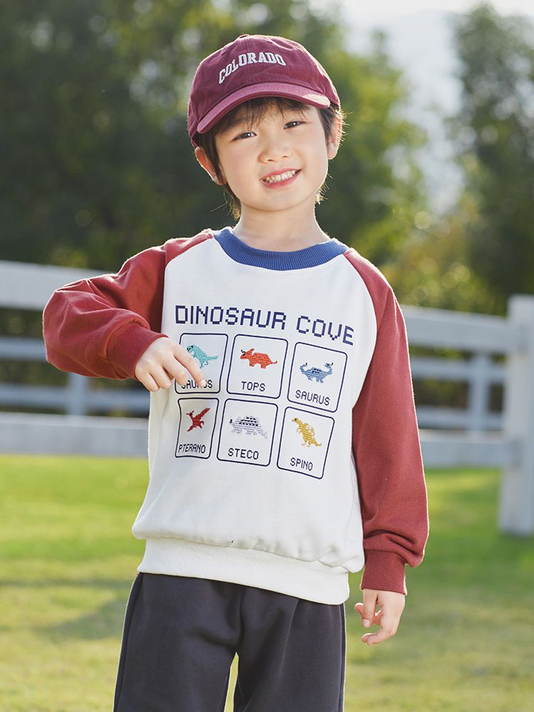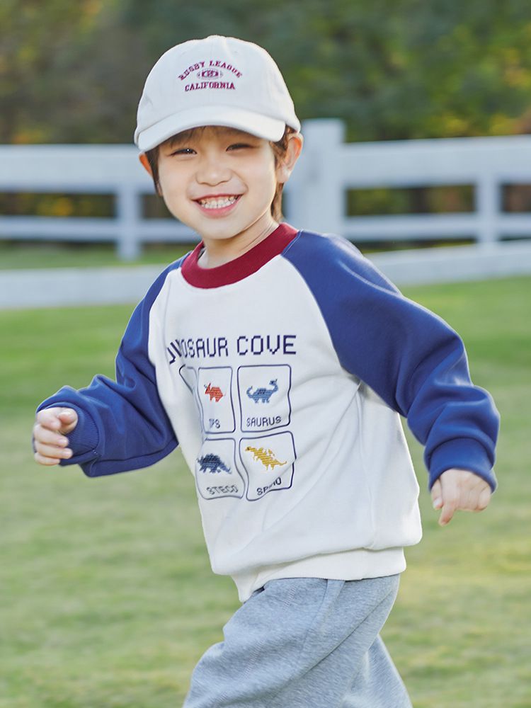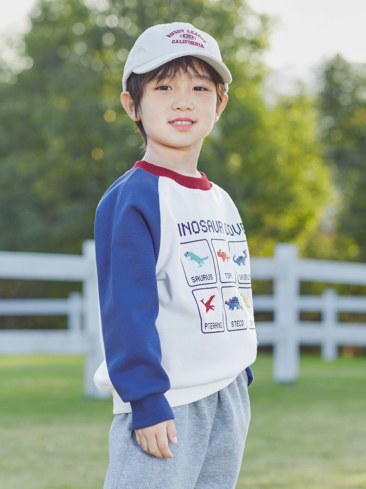 BOMI - 圓領長袖大學T-多彩恐龍-藍+白
