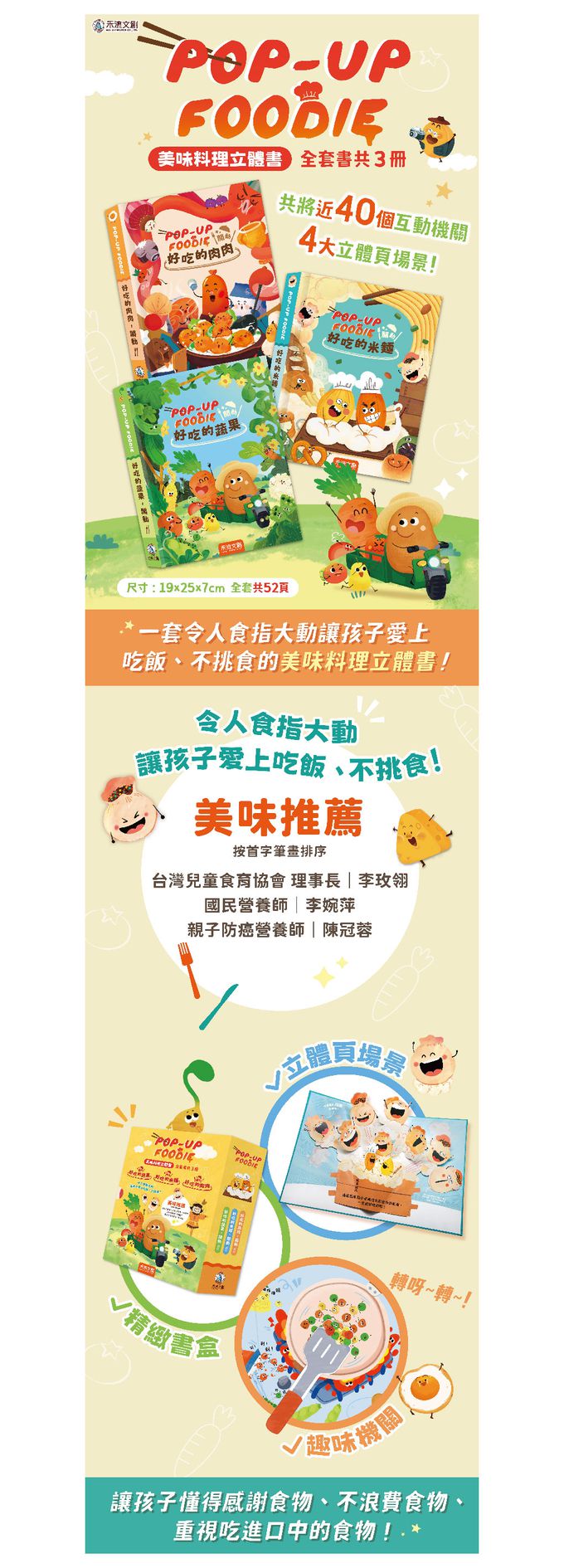 《POP-UP FOODIE》系列以蔬果類、米麵類和肉類為主題,將食物擬人化,透過呈現食物的生長過程和選用材料,啟發孩子對食物的認識,培養他們對食物的喜好和珍惜,同時解決孩子挑食的問題,促進良好的吃飯習慣。
