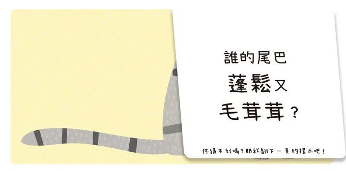 猜猜看是誰有軟軟的毛,還有在搖擺的尾巴?誰的後腿強勁又有力,還有一個圓圓的尾巴呢?往左翻、往右翻、往上翻、往下翻,找出躲藏在頁面後的動物,看看是不是猜對了吧!