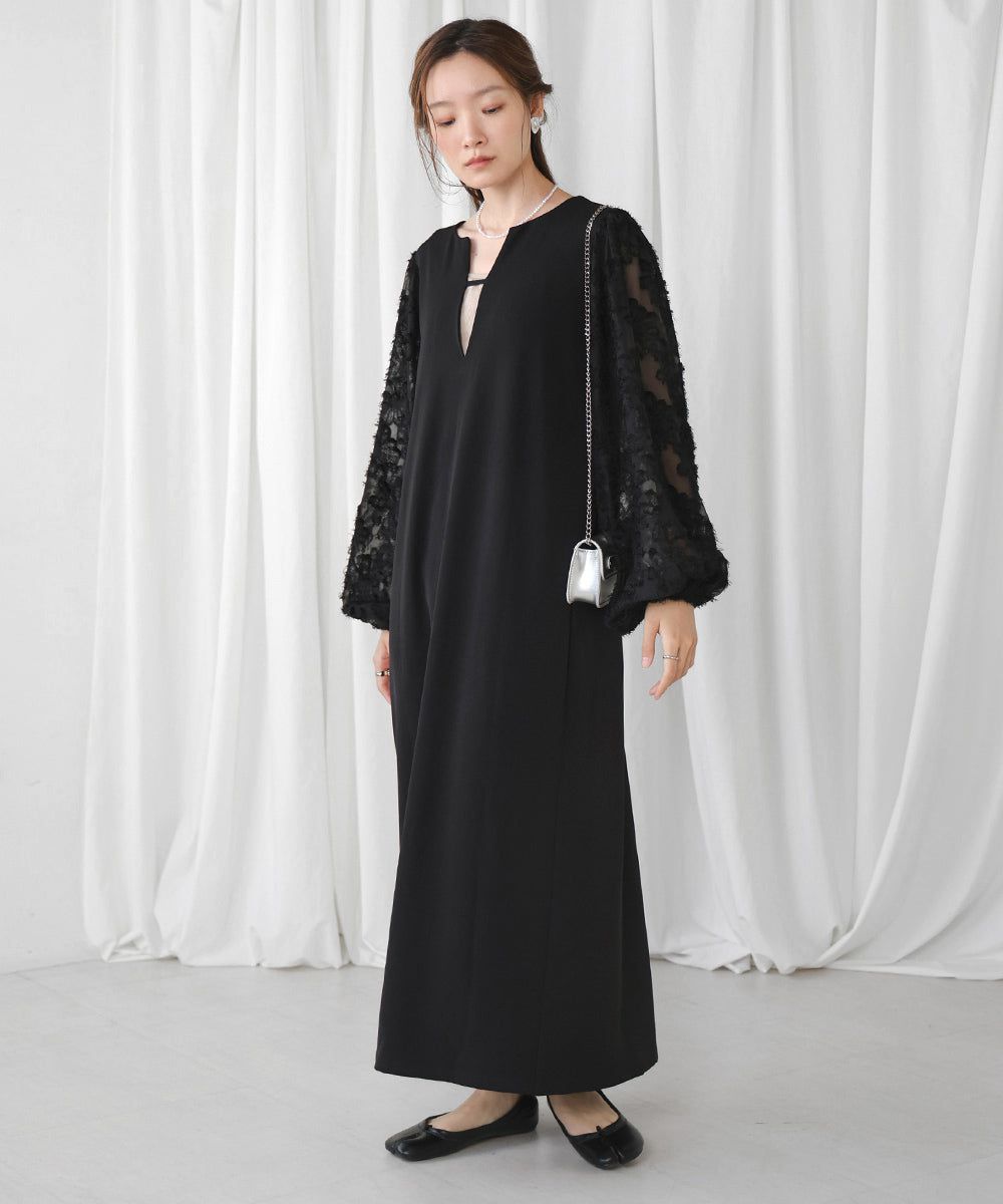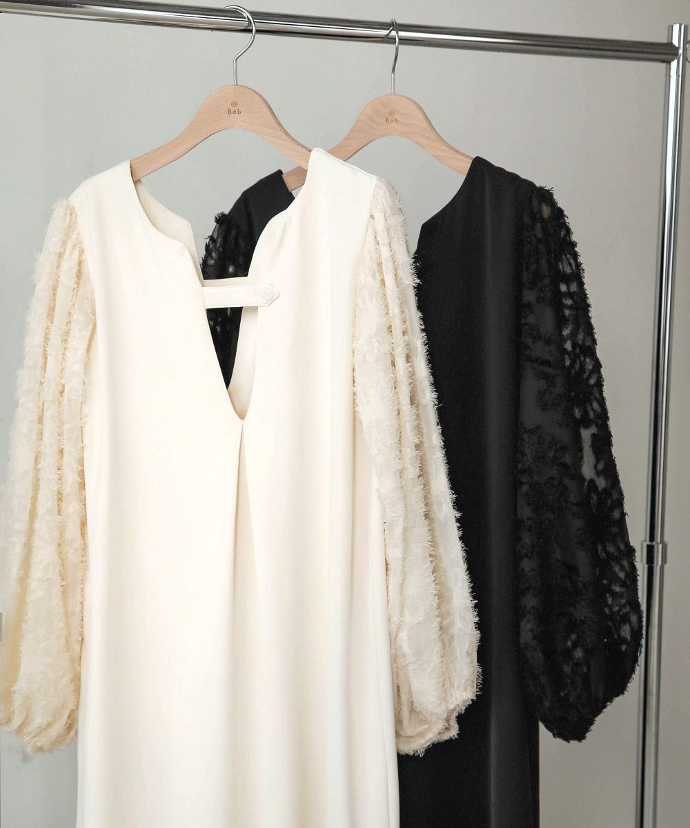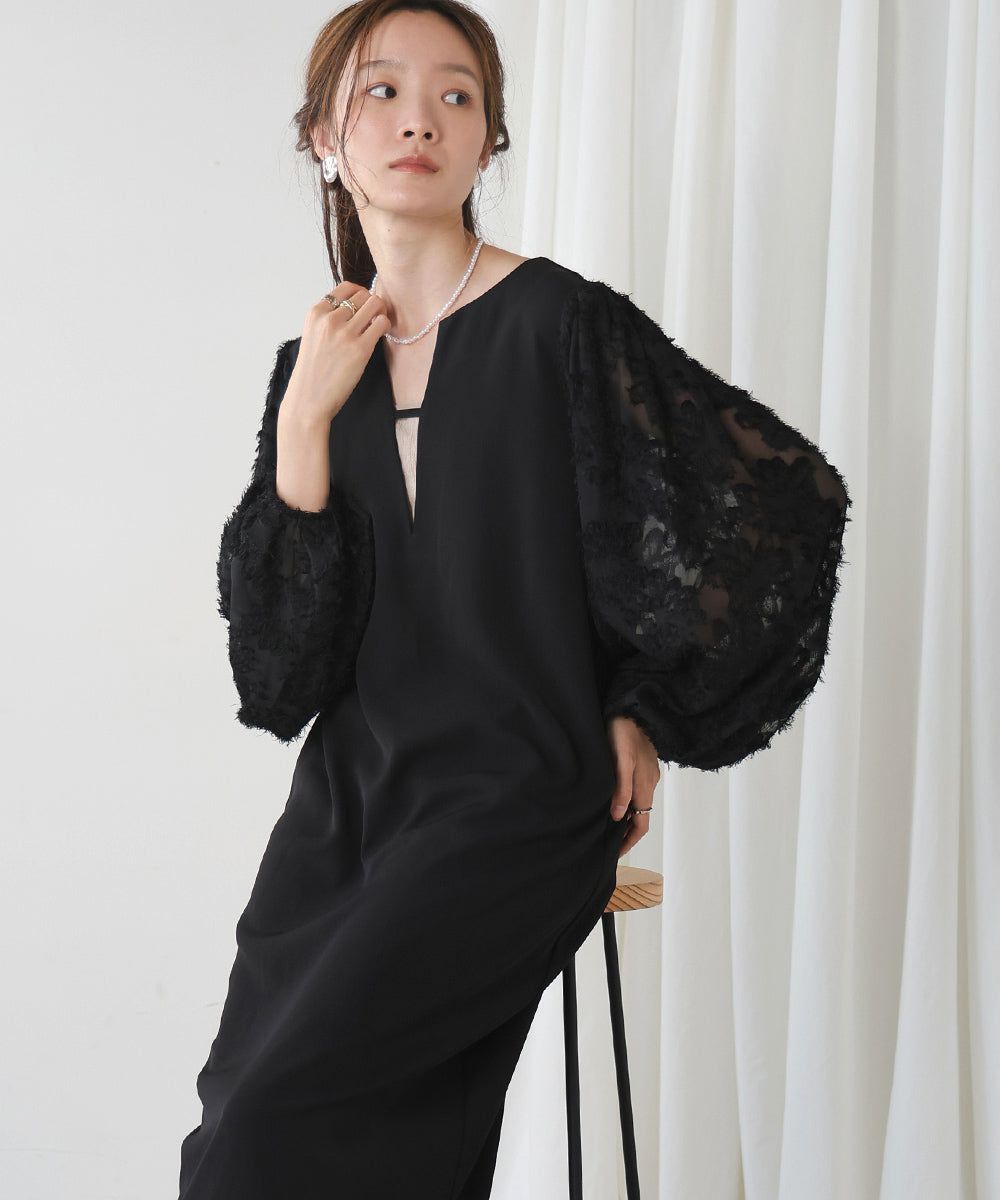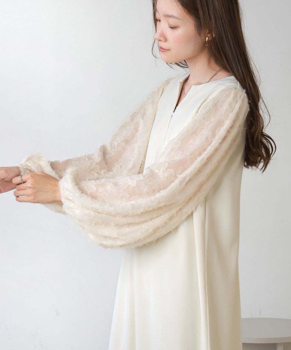 • 品名:透膚羽毛感唯美緹花長袖洋裝