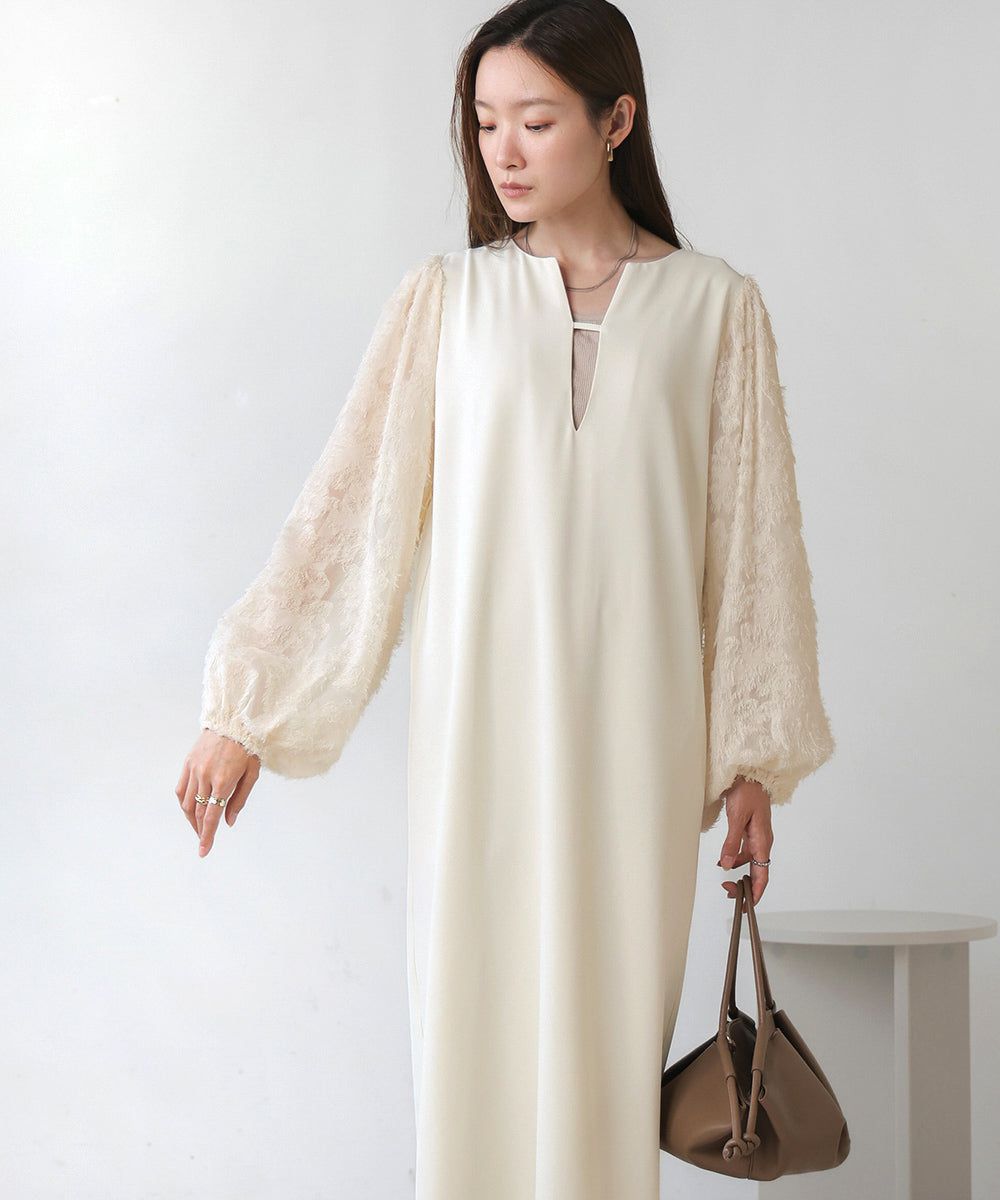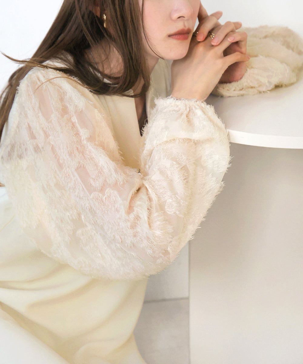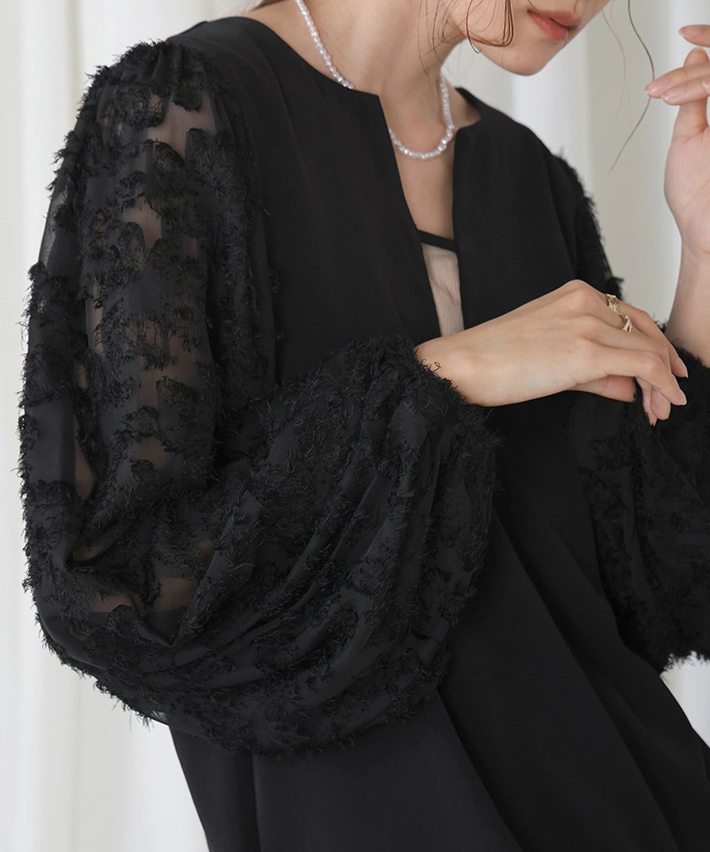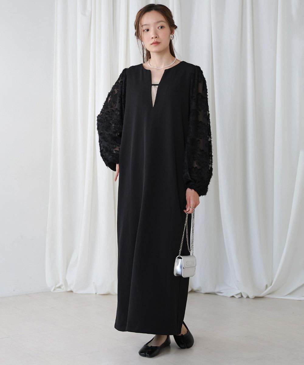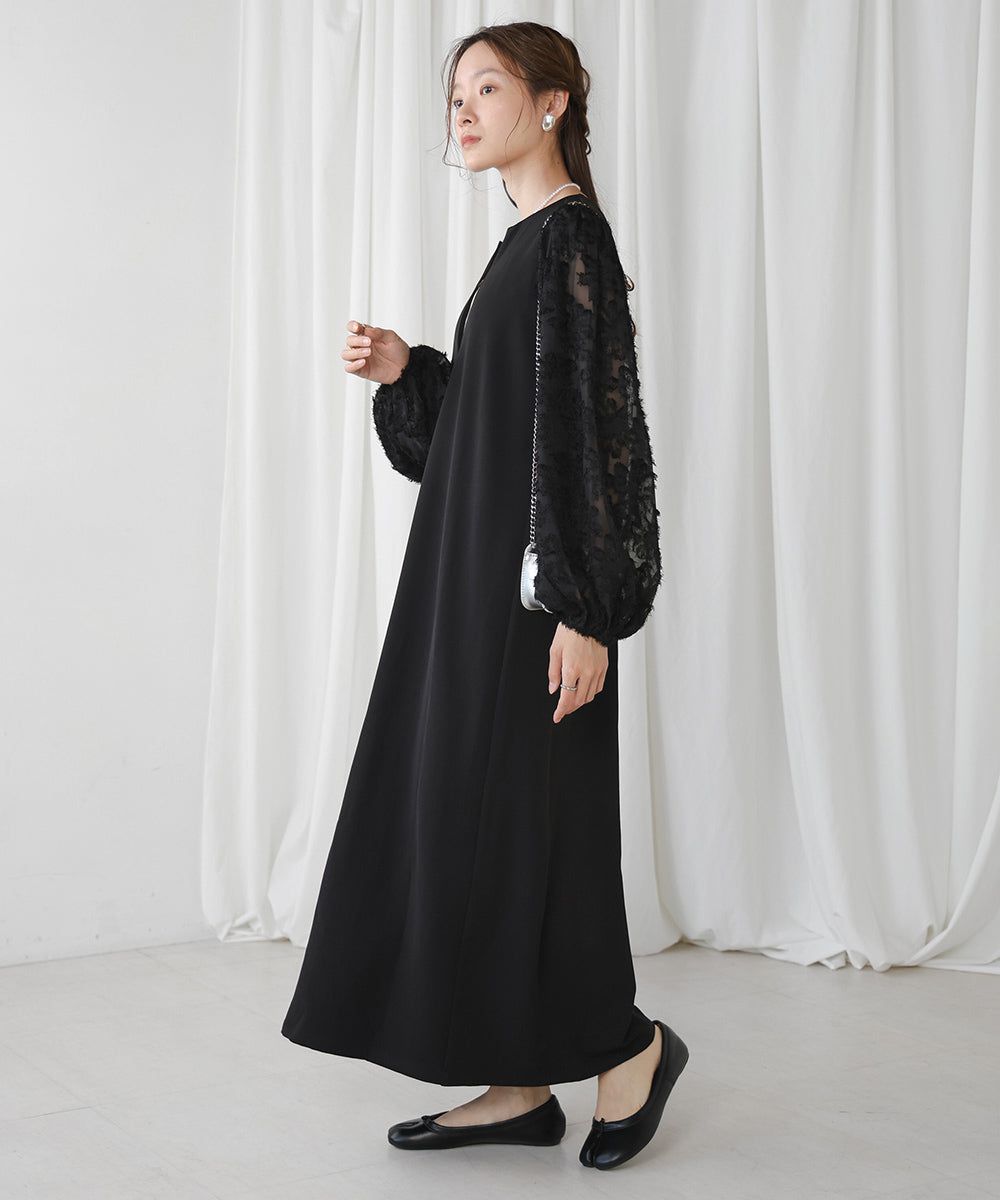 • 品名:透膚羽毛感唯美緹花長袖洋裝