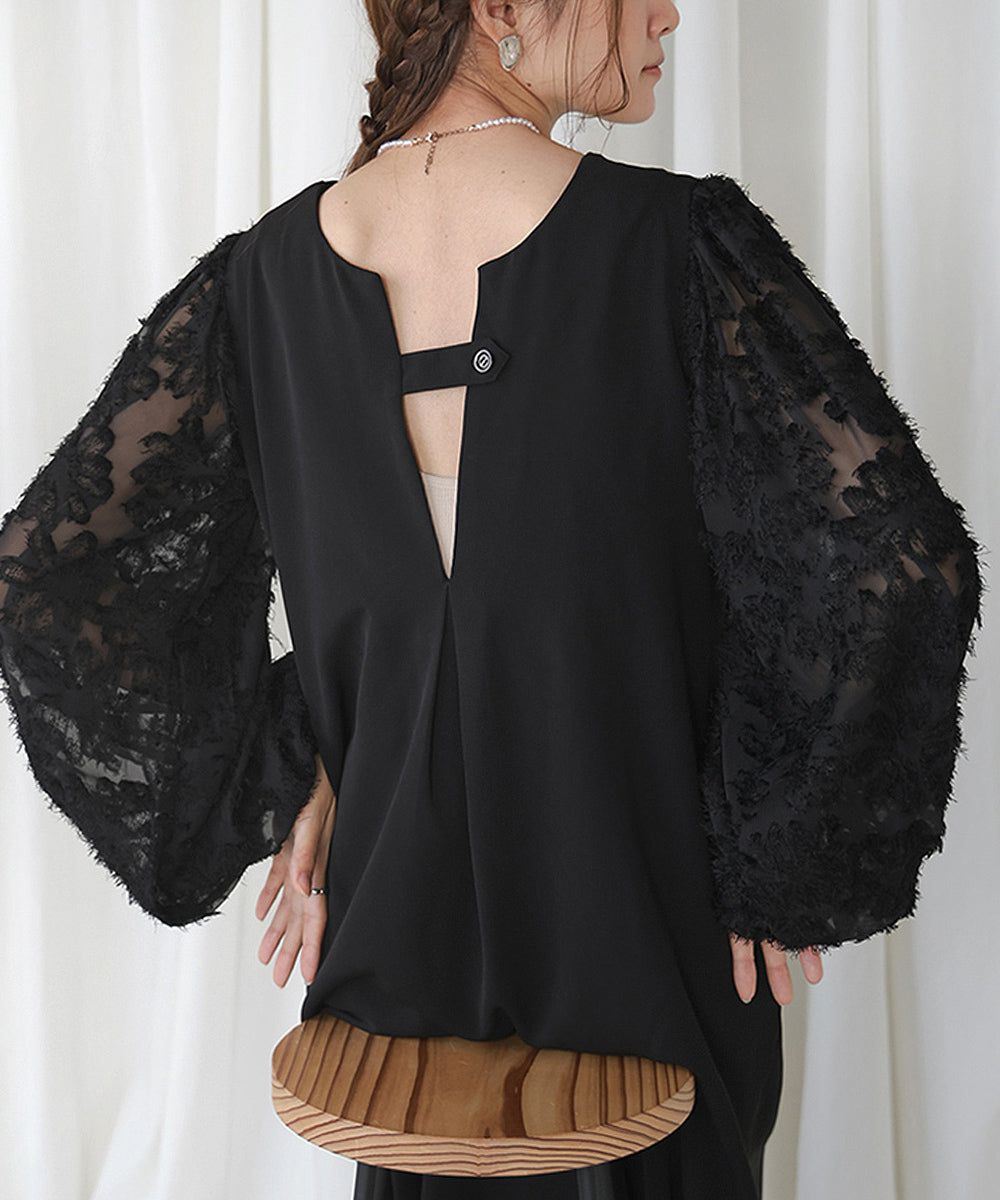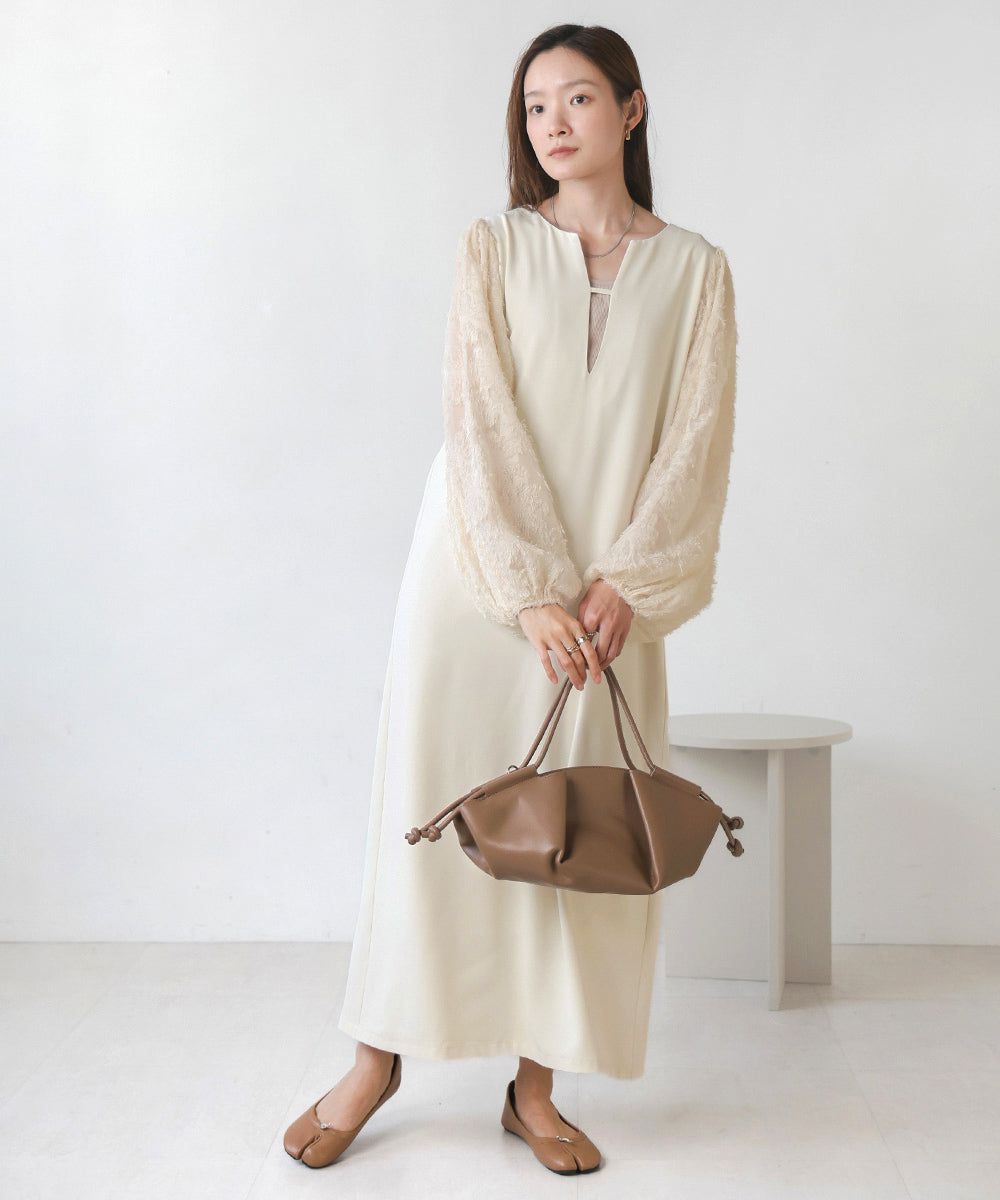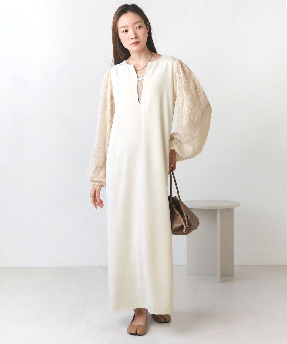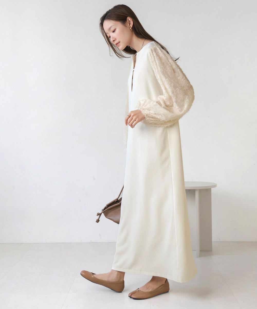 • 品名:透膚羽毛感唯美緹花長袖洋裝