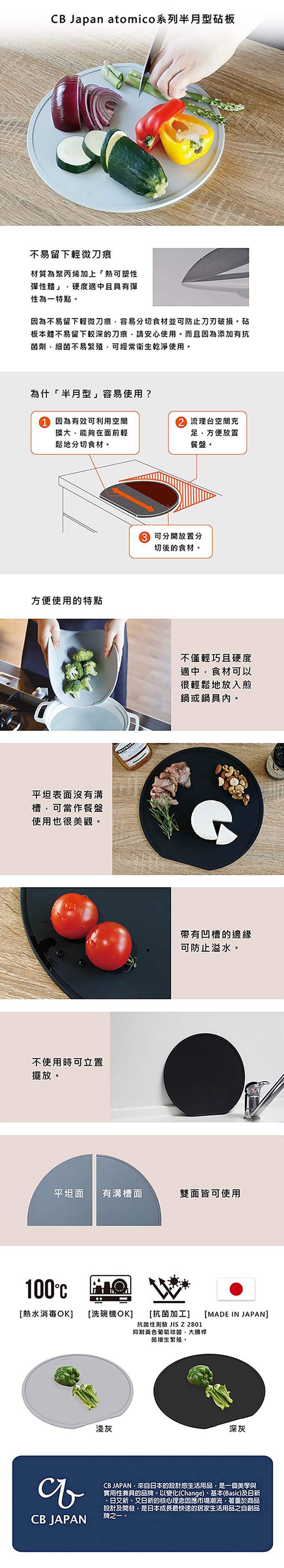 [ 品牌介紹 ]CB JAPAN,來自日本的設計感生活用品,是一個美學與實用性兼具的品牌。以變化(Change)、基本(Basic)及日新、日又新、又日新的核心理念因應市場潮流,著重於商品設計及開發,是日本成長最快速的居家生活用品之自創品牌之一。[ 產品介紹 ]節省使用空間的半月型砧板,材質為聚丙烯+熱可塑性彈性體,硬度適中且具有彈性為一特點。因為不易留下輕微刀痕,容易分切食材並可防止刀刃破損,請安心使用。因有添加抗菌劑,細菌不易繁殖,衛生乾淨可安心使用。