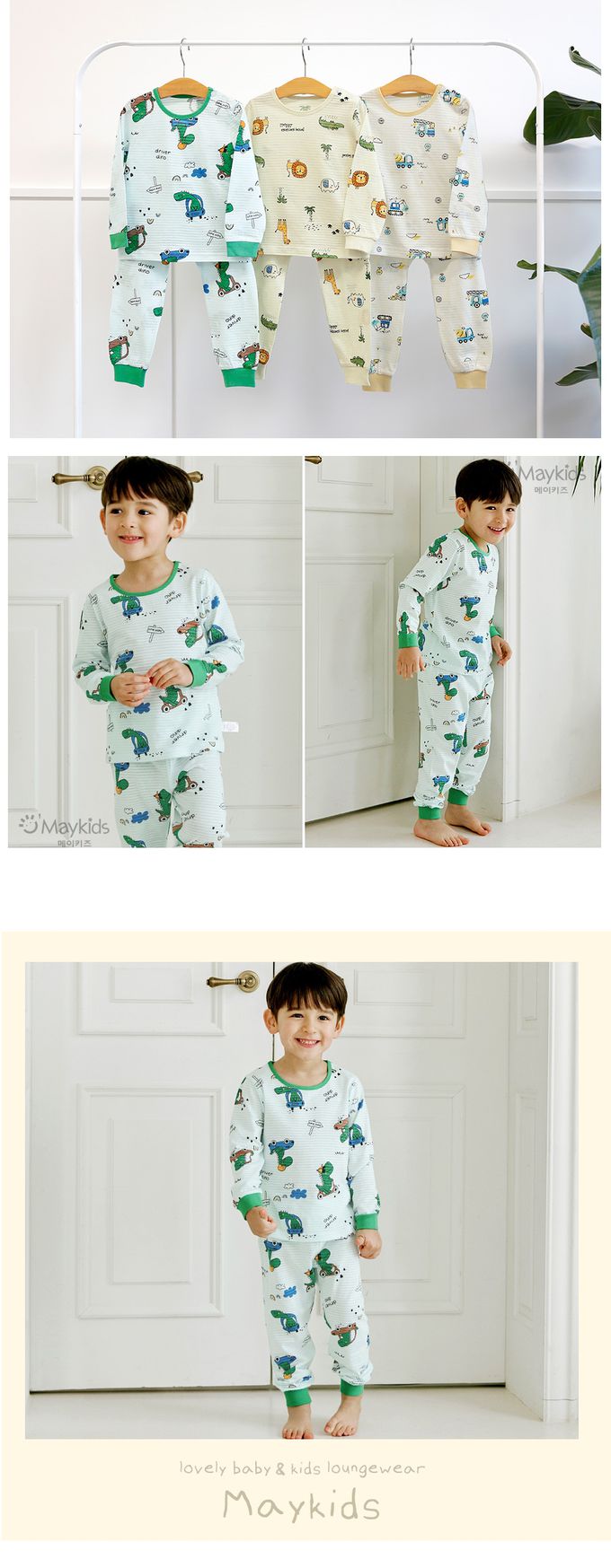 韓國 Maykids - 透氣條紋提花棉長袖家居服-綠恐龍開車