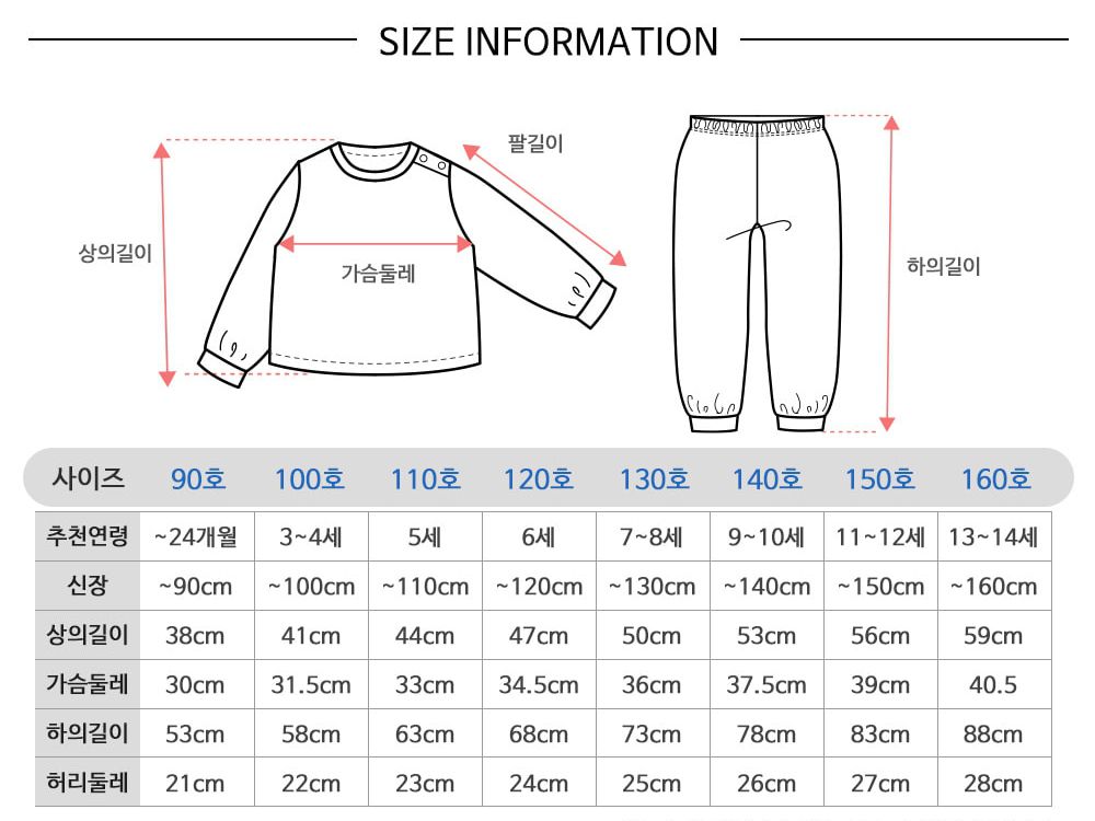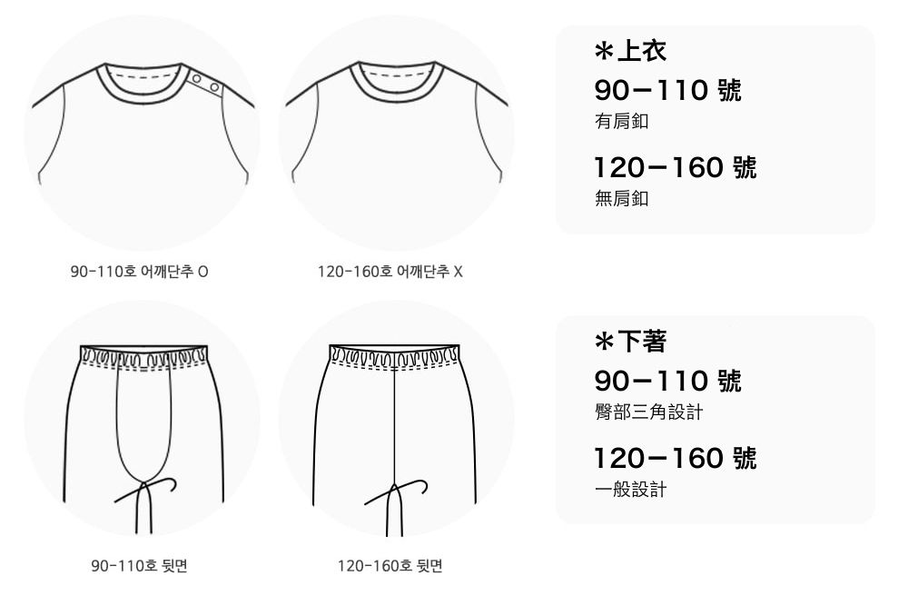 *尺寸表由上而下為:尺寸、建議年齡、身高、衣長、胸寬、褲長、腰寬