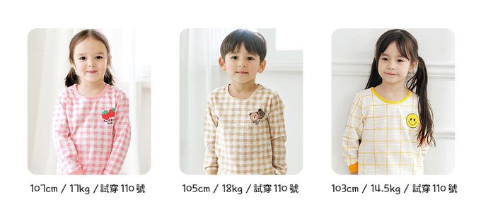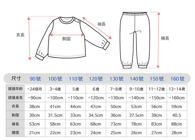 1. 尺寸表單位皆為公分(cm),實際尺寸會因布料彈性、水洗、測量起迄點等因素略有誤差。建議參考孩子平時穿著衣物尺寸進行選購。
