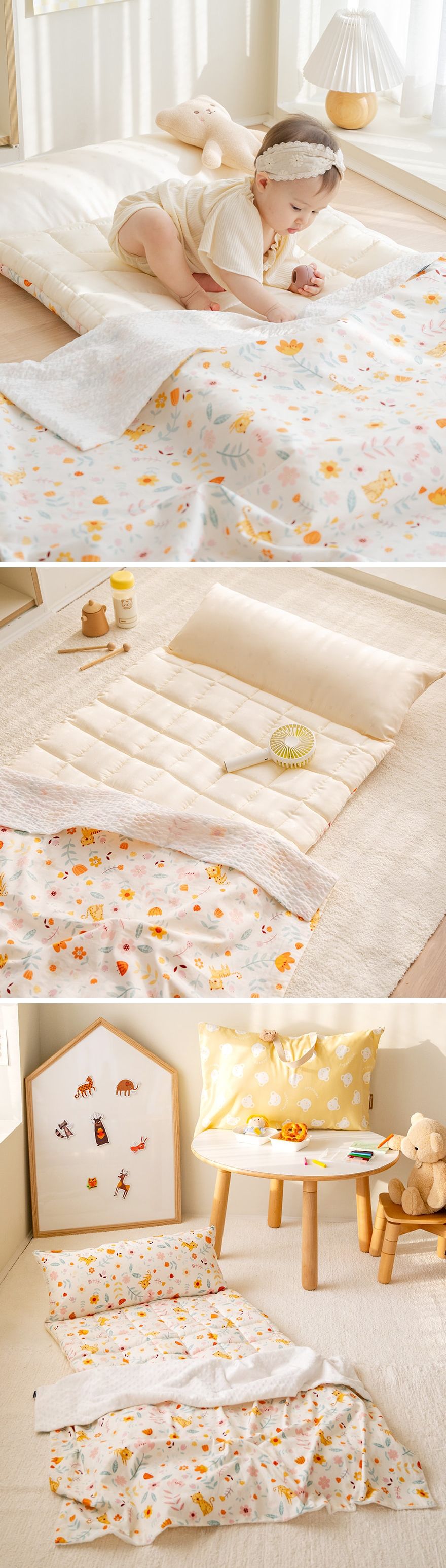 有圖案那面是用精梳棉織成的,四季都適合使用,是睡袋最基本也最經典的材質~而素色這面則是嫘縈所織成,嫘縈屬於涼感纖維,讓寶貝在夏天也不會因為墊子使背部悶熱睡不好!偷偷告訴各位媽咪,其實嫘縈在韓國是非常受歡迎的夏日涼感材質噢!