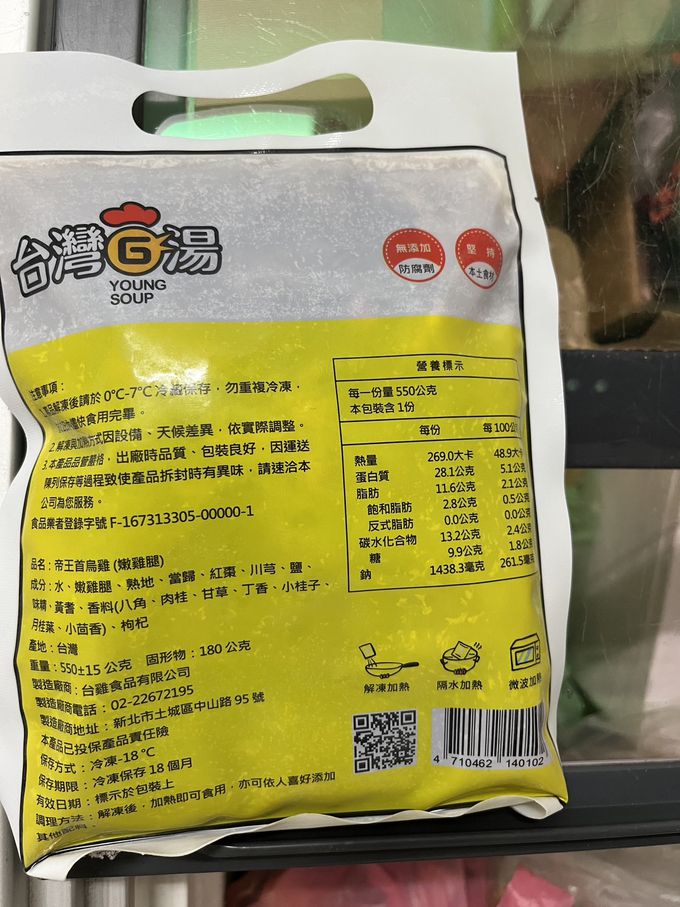 成分:水、嫩雞腿、熱地、當歸、紅棗、川芎、鹽、味精、黃耆、香料(八角、肉桂、甘草、丁香、小桂子、月桂葉、小茴香)、枸杞