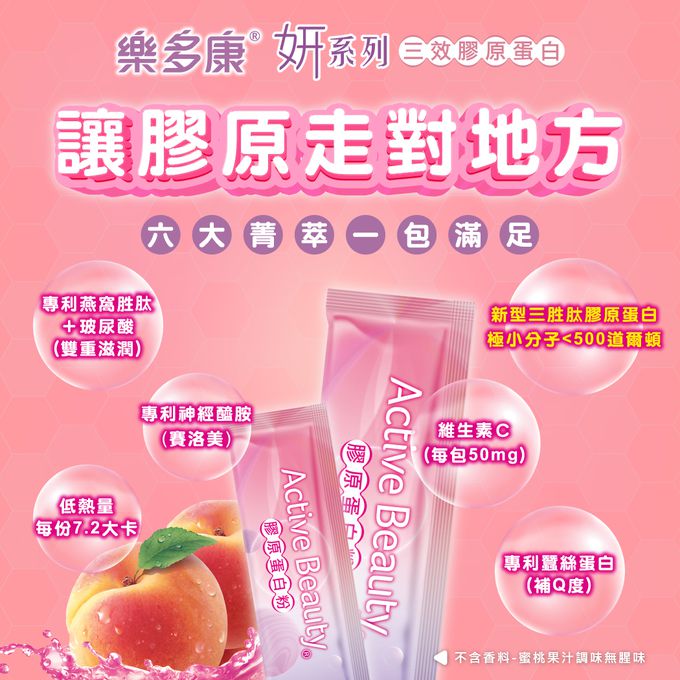 成分:水蜜桃果汁粉(水蜜桃濃縮汁、麥芽糊精)、韓國ButiCTP®專利魚膠原蛋白胜肽(含三胜肽)、卡姆果萃取物(維生素C)、日本蠶絲蛋白(蠶絲蛋白、麥芽糊精)、二氧化矽、流行鏈球菌發酵物(含透明質酸鈉)、專利燕窩胜肽(麥芽糊精、燕窩碎)、專利玄米萃取物[麥芽糊精、米萃取物(含賽洛美)]