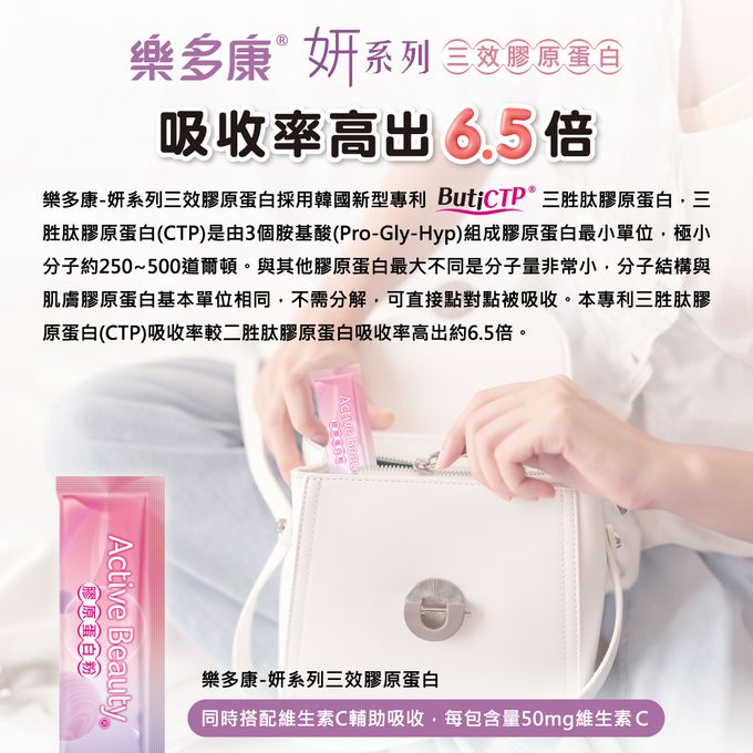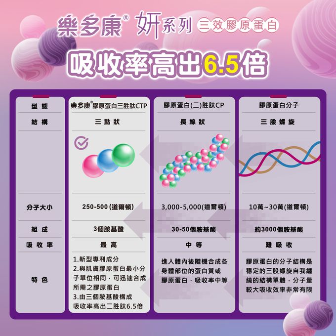 新型專利韓國ButiCTP®三胜肽膠原蛋白-極小分子 250~500道爾頓,吸收率比膠原蛋白二肽高出6.5倍。