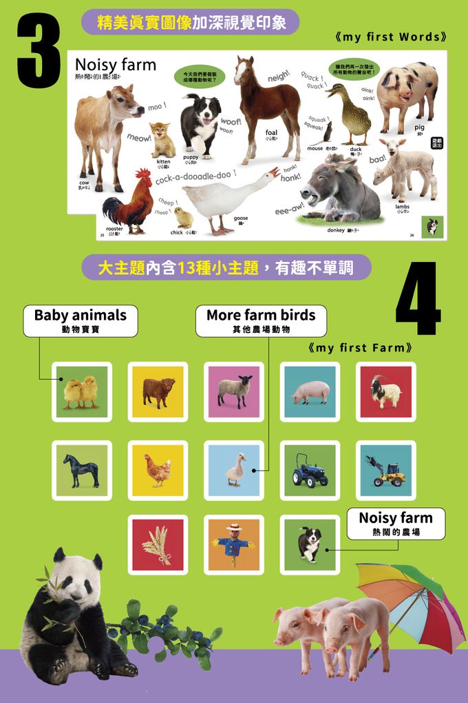 來自英國DK授權的my first系列~特色就是具有可愛明亮、色彩豐富的真實照片!還有清楚的中英文單詞(附注音)與互動問答遊戲!培養早期的口語、聽力、詞彙、識別物體和觀察技能,是一本很好的幼幼圖解認知書~