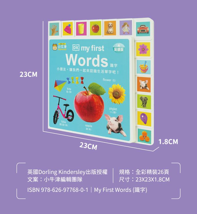 來自英國DK授權的my first系列~特色就是具有可愛明亮、色彩豐富的真實照片!還有清楚的中英文單詞(附注音)與互動問答遊戲!培養早期的口語、聽力、詞彙、識別物體和觀察技能,是一本很好的幼幼圖解認知書~