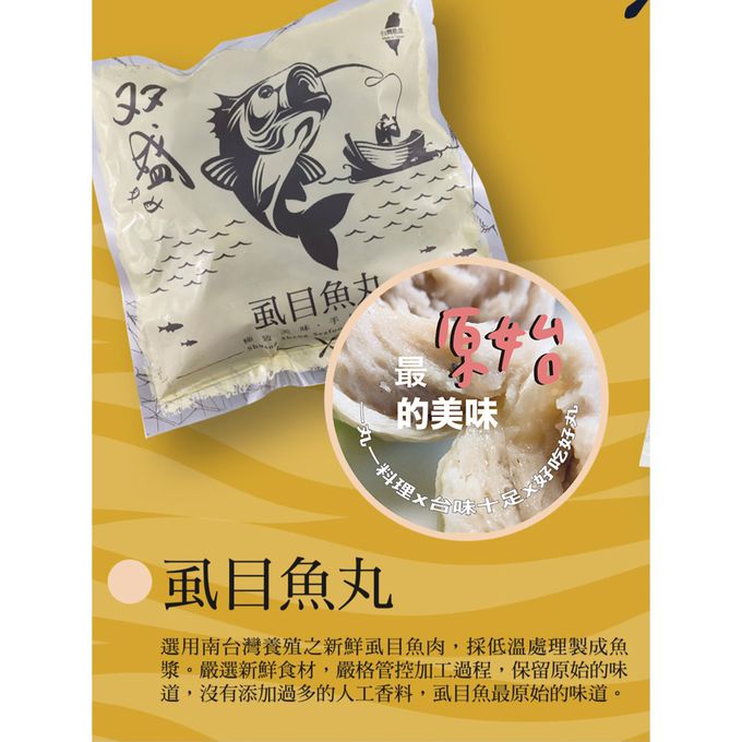 成分:虱目魚肉、豬脂(台灣)、蒜頭、糖、鹽、胡椒粉、磷酸二澱粉、調味劑(L-麩酸鈉、胺基乙酸、DL-胺基丙酸、琥珀酸二鈉、5’-次黃嘌呤核苷磷酸二鈉、5’-鳥嘌呤核苷磷酸二鈉)、複方品質改良劑(多磷酸鈉、偏磷酸鈉、酸性焦磷酸鈉、偏磷酸鉀、二氧化矽)、複方甜味劑(醋磺內酯鉀、二氧化矽)