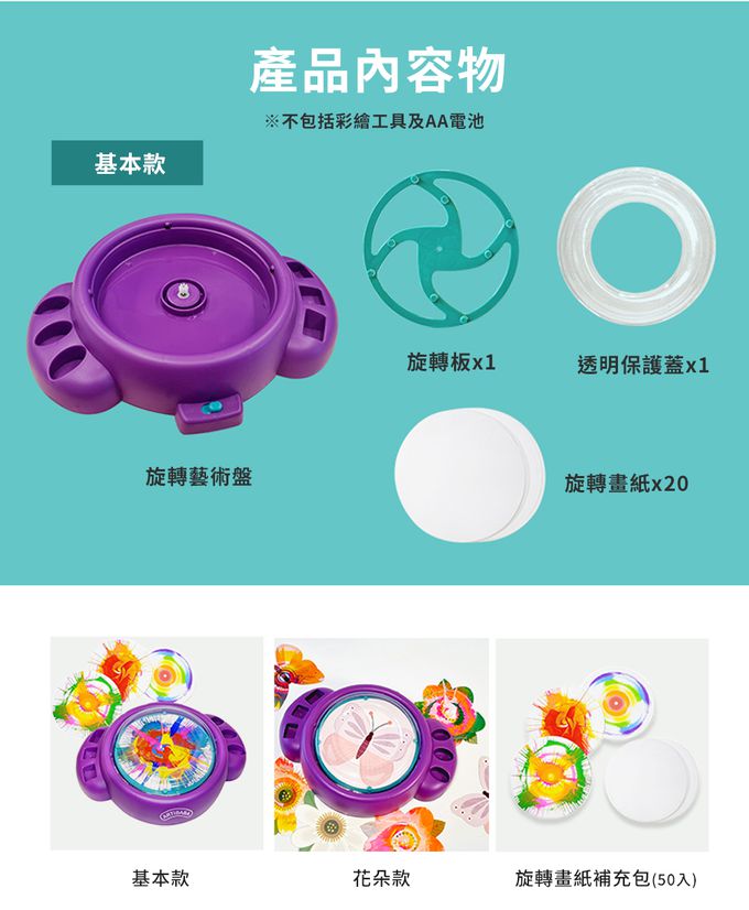 內容物:旋轉藝術本體*1、旋轉板*1、透明保護蓋*1、旋轉畫紙*20