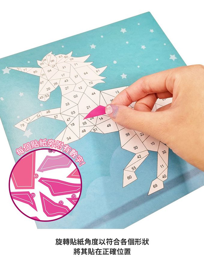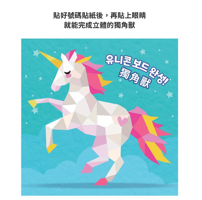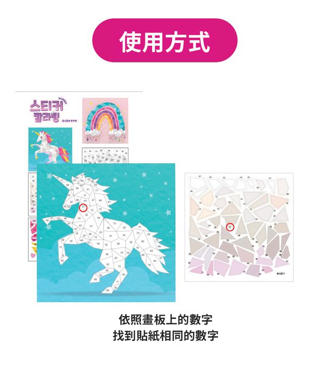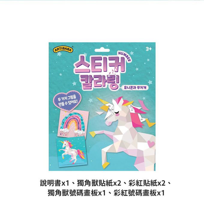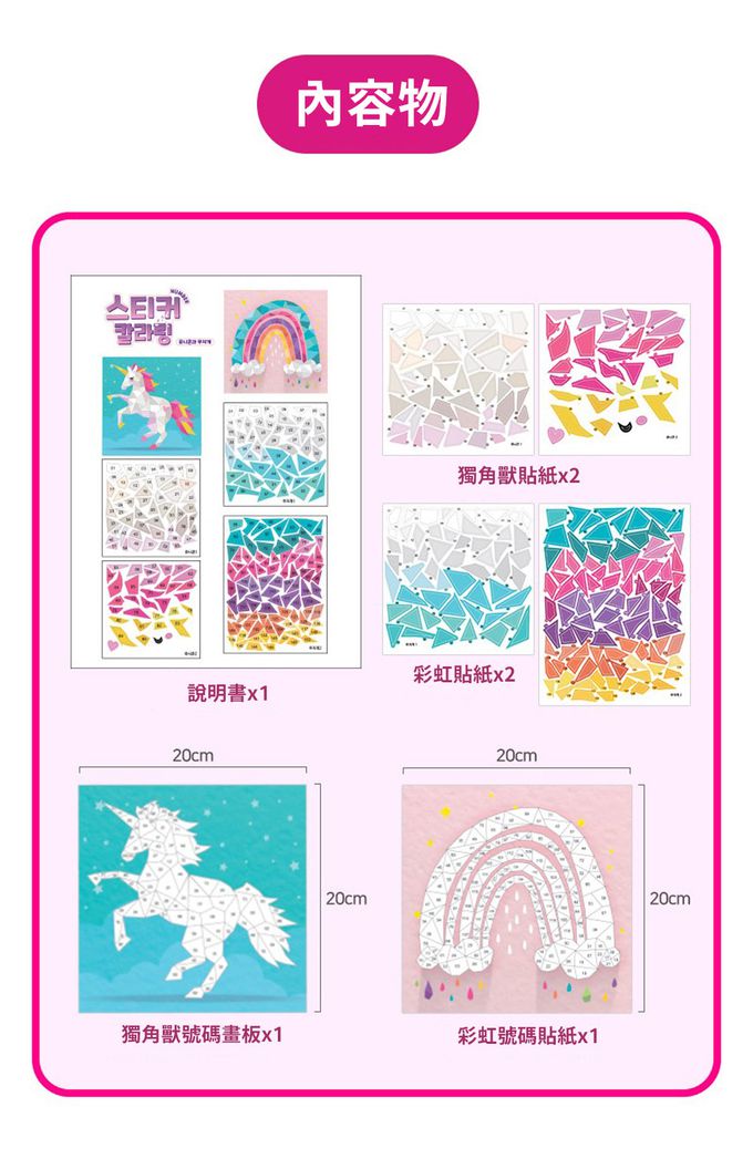 內容物:說明書*1、獨角獸貼紙*2、彩紅貼紙*2、獨角獸號碼畫板*1、彩紅號碼畫板*1