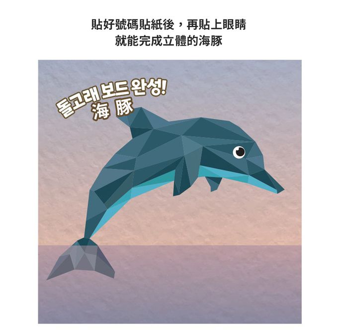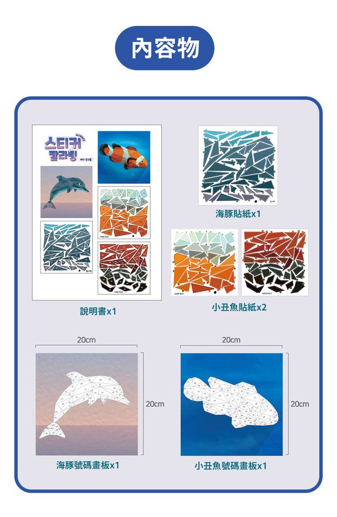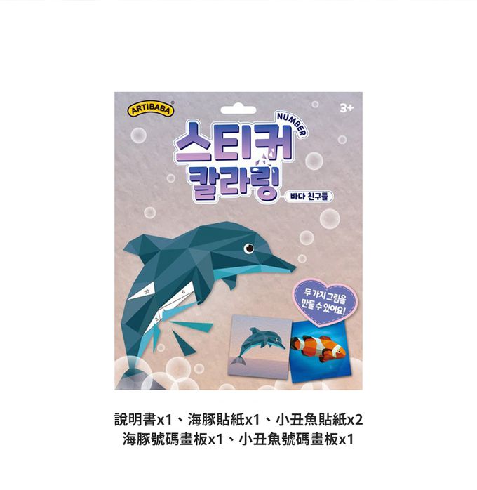 內容物:說明書*1、海豚貼紙*1、皇冠魚貼紙*2、海豚號碼畫板*1、小丑魚號碼畫板*1