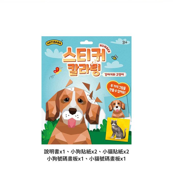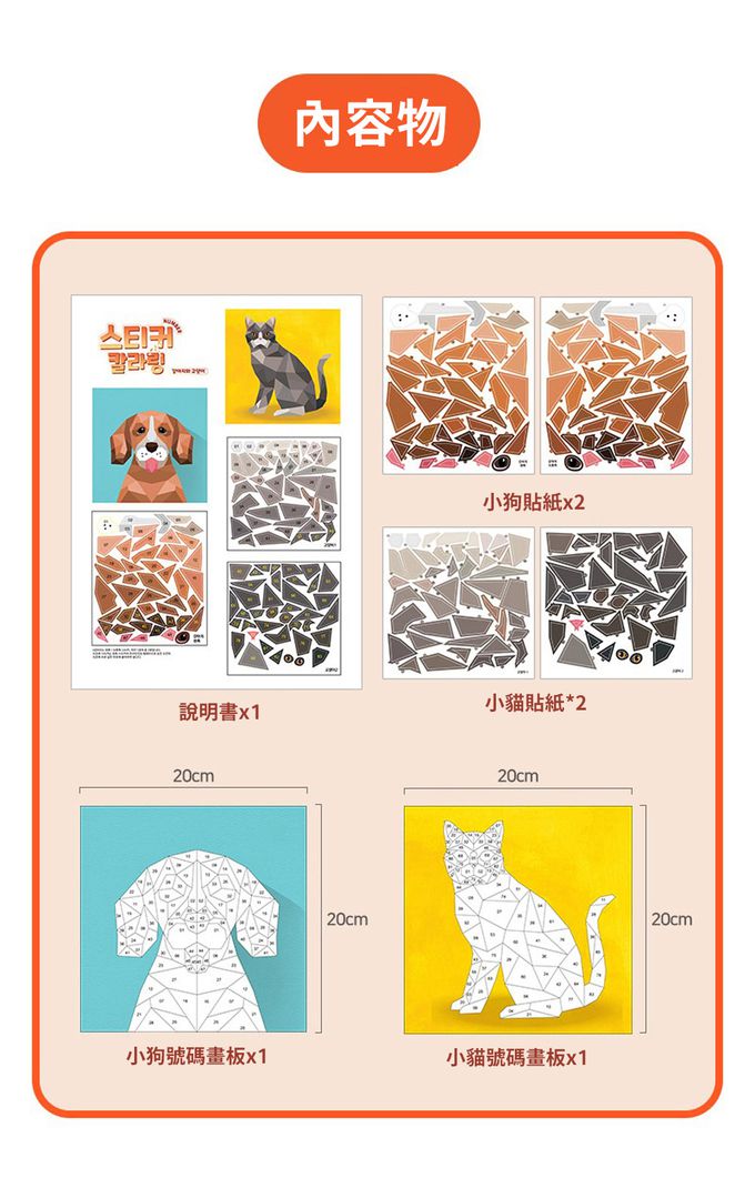 內容物:說明書*1、小狗貼紙*2、小貓貼紙*2、小狗號碼畫板*1、小貓號碼畫板*1