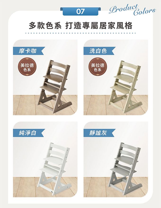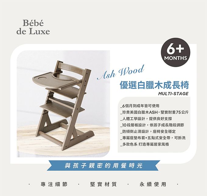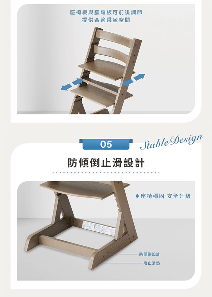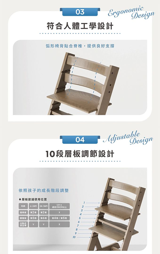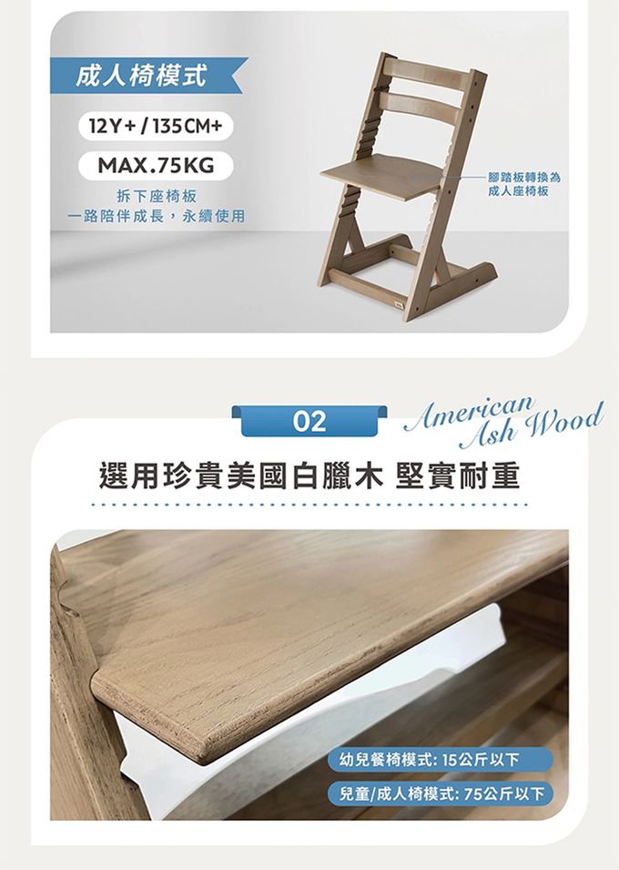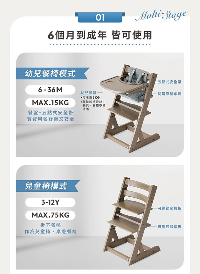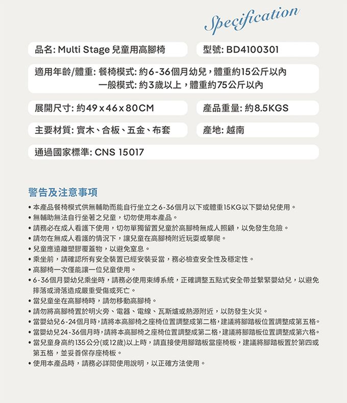 注意事項:適用年齡/體重:《餐椅模式》約6-36個月幼兒,體重約15公斤以內;《一般模式》約3歲以上,體重約75公斤以內 產品重量:約8.5kgs 展開尺寸:約49x46x80cm 主要材質:實木、合板、五金、布套 產地:越南 通過國家標準:CNS 15017 【注意事項】 ● 本產品餐椅模式供無輔助而能自行坐立之6-36個月以下或體重15KG以下嬰幼兒使用。 ● 無輔助無法自行坐著之兒童,切勿使用本產品。 ● 請務必在成人看護下使用,切勿單獨留置兒童於高腳椅無成人照颜,以免發生危險。 ● 請勿在無成人看護的情况下,讓兒童在高腳椅附近玩耍或攀爬。 ● 兒童應遠離塑膠覆蓋物,以避免室息。 ● 乘坐前,請確認所有安全裝置已經安裝妥當,務必檢查安全性及穩定性。 ● 高腳椅一次僅能讓一位兒童使用。 ● 6-36個月嬰幼兒乘坐時,請務必使用束縛系統,正確調整五貼式安全帶並繫緊嬰幼兒,以避免摔落或滑落造成嚴重受傷或死亡。 ● 當兒童坐在高腳椅時,請勿移動高腳椅。 ● 請勿將高腳椅置於明火旁、電器、電線、瓦斯爐或熱源附近,以防發生火災。 ● 當嬰幼兒6-24個月時,請將本高腳椅之座椅位置調整成第二格,建議將腳踏板位置調整成第五格。 ● 當嬰幼兒24-36個月時,請將本高腳椅之座椅位置調整成第二格,建議將腳踏板位置調整成第六格。 ● 當兒童身高約135公分(或12歲)以上時,請直接使用腳踏板當座椅板,建議將腳踏板置於第四或第五格,並妥善保存座椅板。 ● 使用本產品時,請務必詳閱使用說明,以正確方法使用。