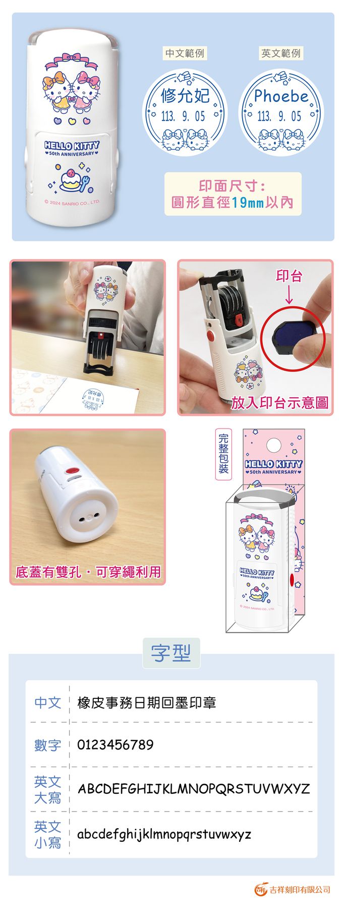品名:Hello Kitty 50週年系列-生日快樂(2) 日期章-民國年-藍色墨-印面尺寸:圓形直徑1.9公分