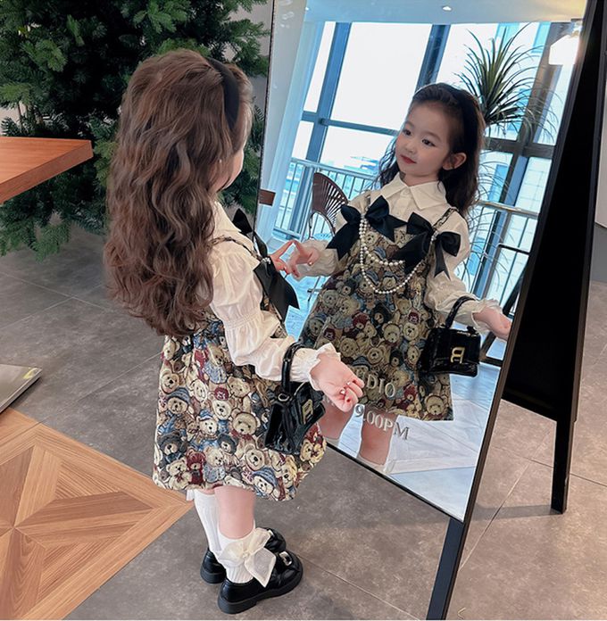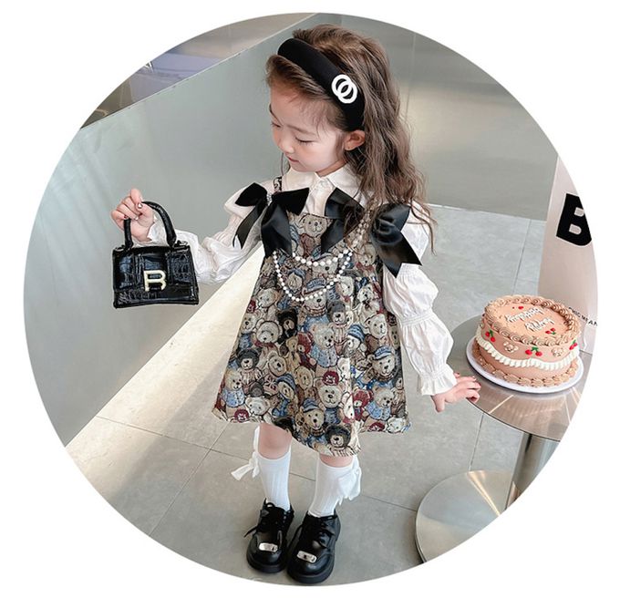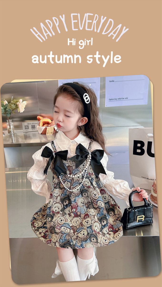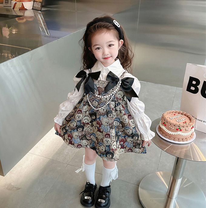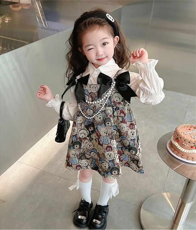 小熊提花背心洋裝配襯衫及可拆式蝴蝶結-三件套