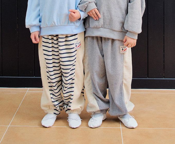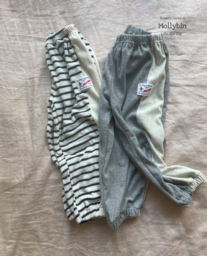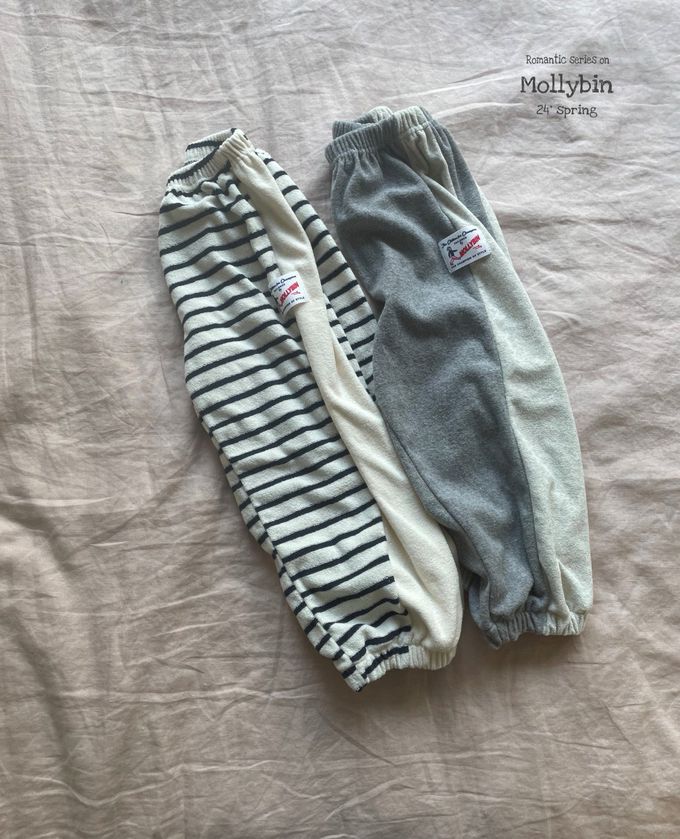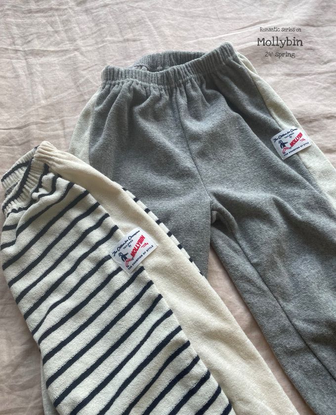韓國 Mollybin - 鬆緊腰布標裝飾寬鬆長褲-條紋-米白