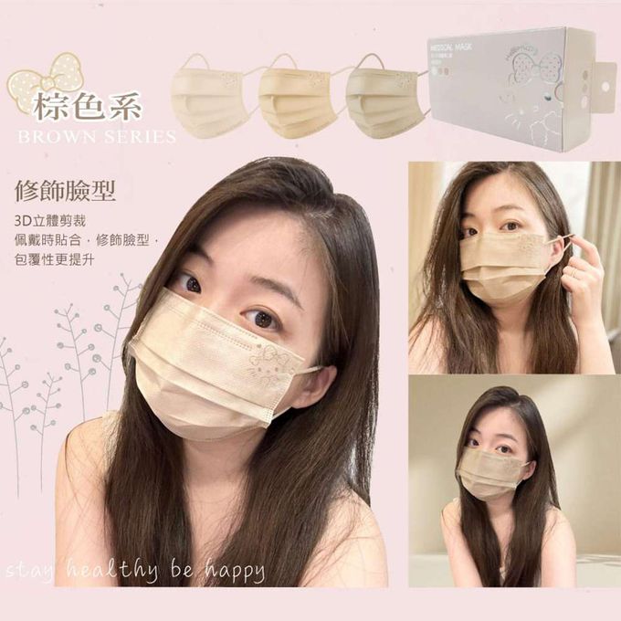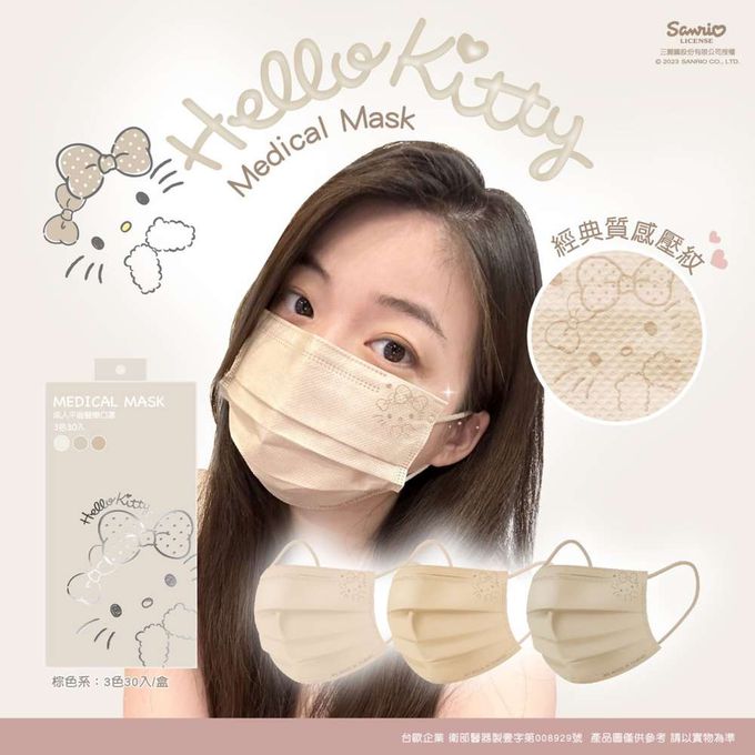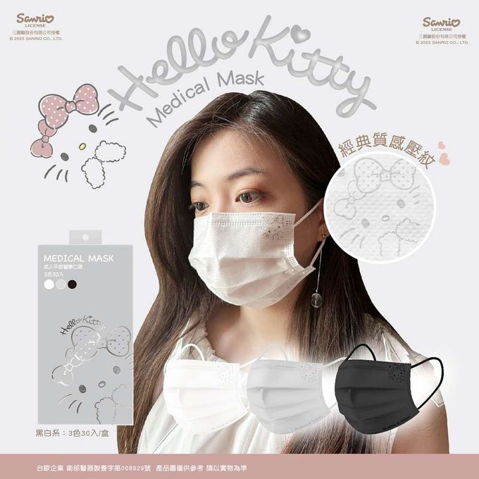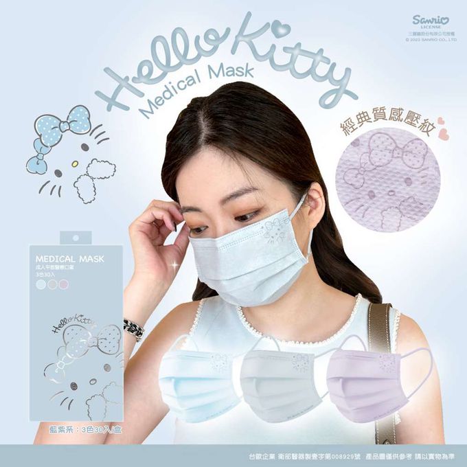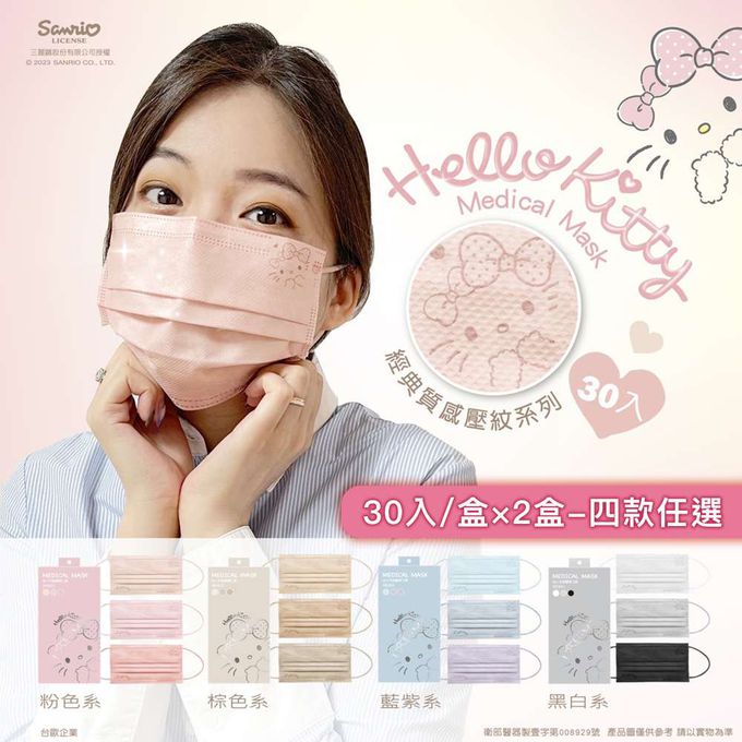 台歐 - Hello Kitty 聯名款平面經典質感壓紋成人醫療口罩-4色款*30片/盒*2盒-摩達客推薦