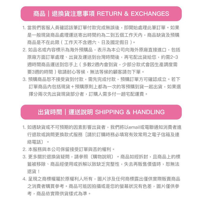 預購商品:預購為海外同步代購,遇缺貨即會通知媽咪並協助取消退款事宜。
