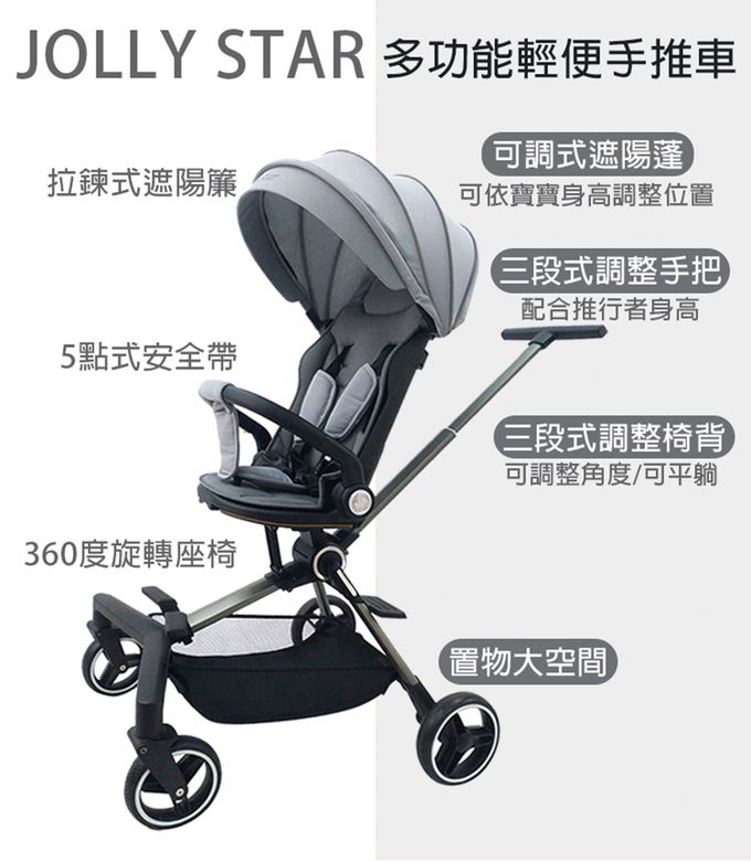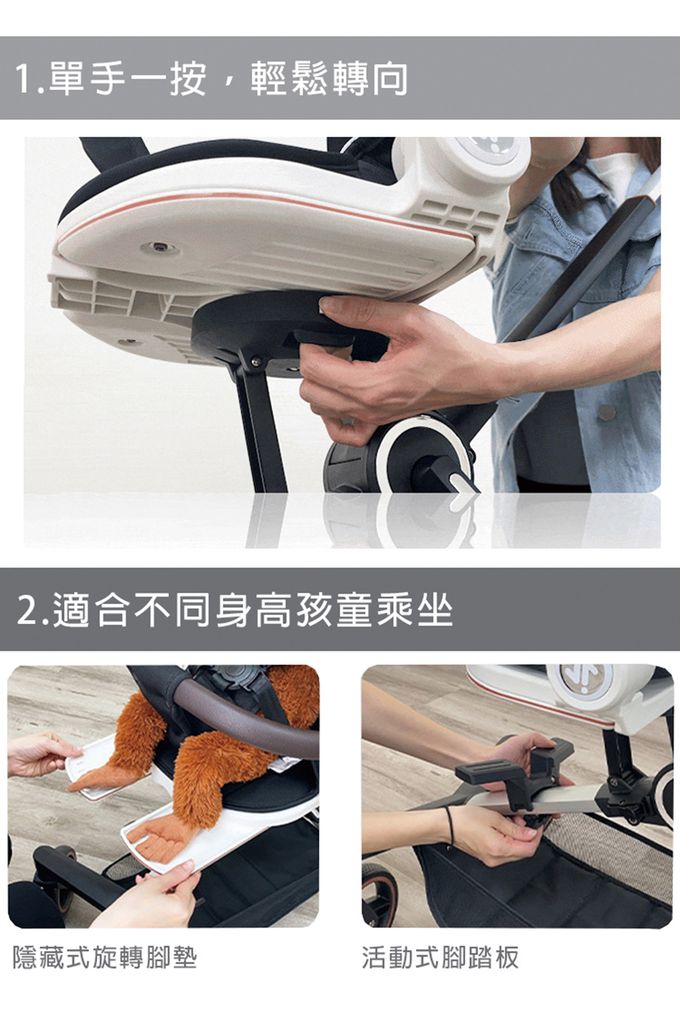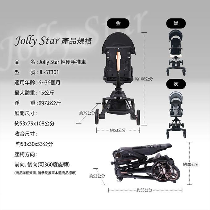 注意事項:適用年龄:6 ~ 36個月 最大體重:15公斤 淨重:約7.8公斤 展開尺寸:約53x79x108公分 收合尺寸:約53x30x53公分 座椅方向:前向、後向;可360度旋轉 商品檢驗標識號:(I)C2 0302705 (商品詳細資訊,請參見推車本體商品標示) 【注意事項】 ● 乘坐時請務必繋好安全帶。 ● 不可讓嬰幼兒站立。 ● 禁止於樓梯間使用手推車。 ● 本產品不適用於6個月以下的嬰幼兒。 ● 不得將嬰幼兒單獨留置車上無人看護。 ● 推車不移動時,請確實使用煞車裝置。 ● 安全帶或束縛系統必須正確的扣合及使用。 ● 使用時應遠離高溫、水池或電源之臨近範圍。 ● 不可將手推車放置於馬路、道或危險場所。 ● 使用時確保所有定裝置都已處於鎖定狀態。 ● 不得附載其它的嬰幼兒、物品或附件於推車上。 ● 嬰幼兒乘坐於手推車內時不可將整台車往上提和靠背調整。 ● 不可在手把上懸掛任何提袋或放置任何物品,以免影響推車穩定性。 ● 當調整手推車上之任何可活動配件時,必須確定嬰幼兒的體與車台保持安全距離。 ● 超載或不正確的折疊及使用非經核准的零附件都可能造成車台損壞、故障或不安全,請務必閱讀產品說明書。