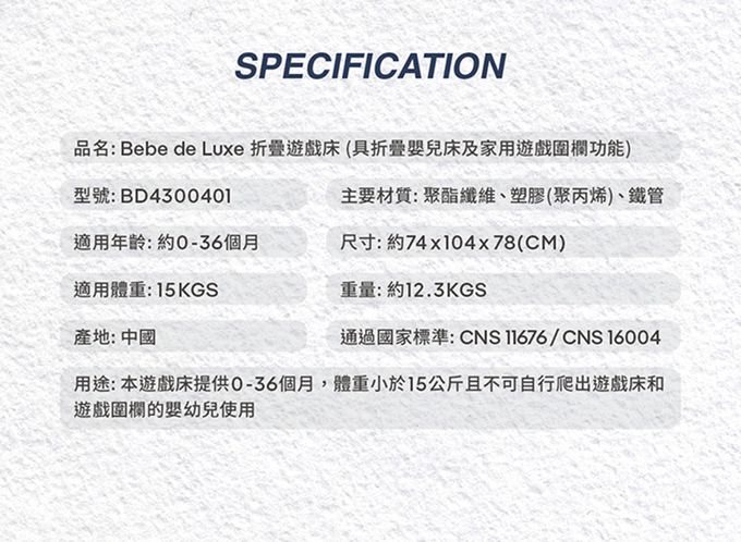 • 注意事項:適用年齡:約0-36個月 適用體重:15kgs 重量:約12.3kgs 展開尺寸:約74x104x78cm 主要材質:聚酯纖維、塑膠(聚丙烯)、鐵管 產地:中國 商品檢驗標識號:R35234 通過國家標準:CNS 11676 / CNS 16004 【注意事項】 ● 本遊戲床提供0-36個月,體重小於15公斤且不可自行爬出遊戲床和遊戲圍欄的嬰幼兒使用。