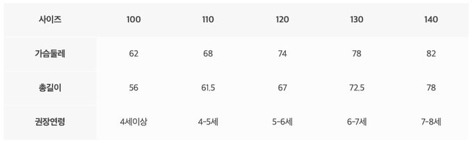 尺寸表由上而下為:尺寸、胸圍、總長、建議年齡