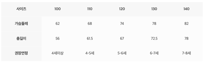 尺寸表由上而下為:尺寸、胸圍、總長、建議年齡