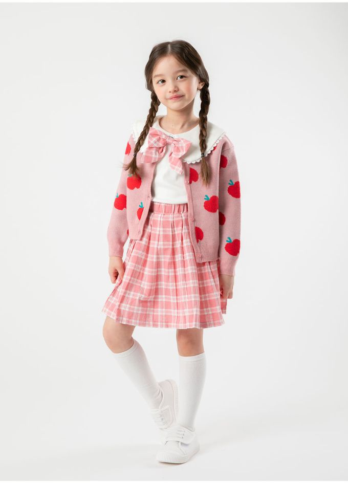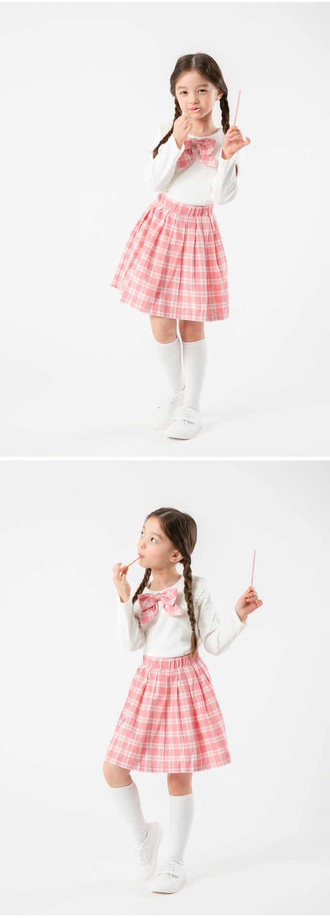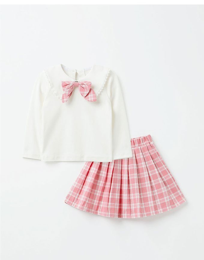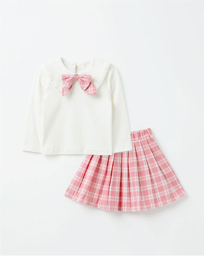 韓國 OZKIZ - 學院襯衫上衣格紋短裙套裝-米白X粉