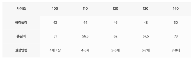 尺寸表由上而下為:尺寸、腰圍、總長、建議年齡