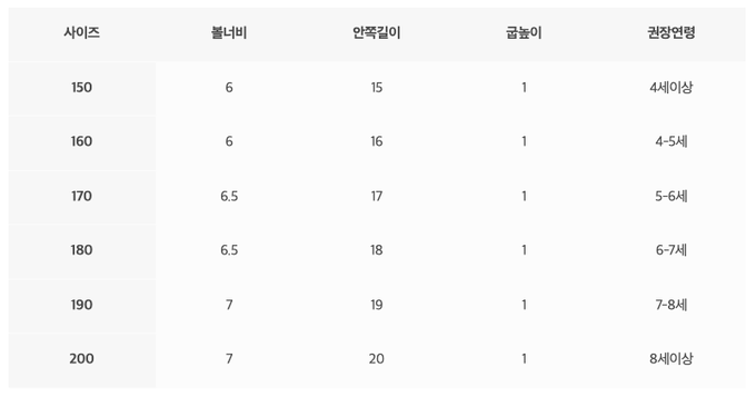 尺寸表由左至右為:尺寸、鞋寬、腳長、跟高、建議年齡