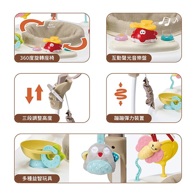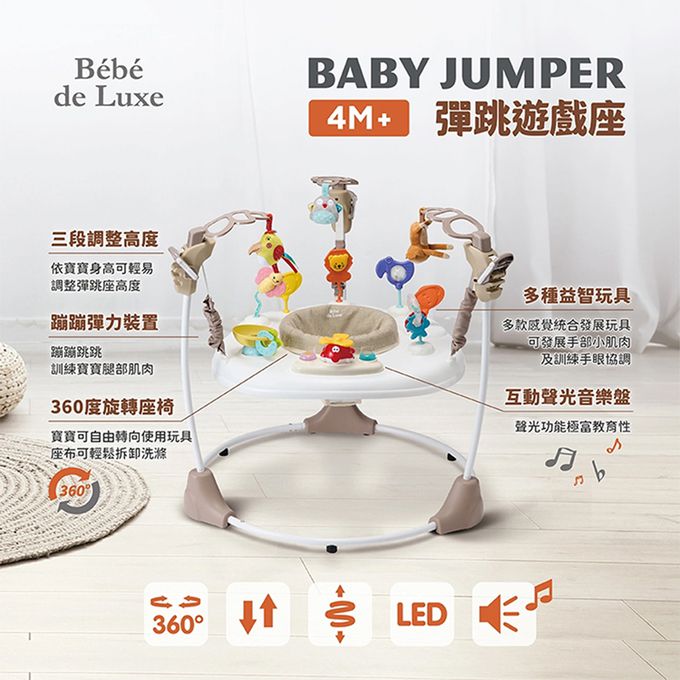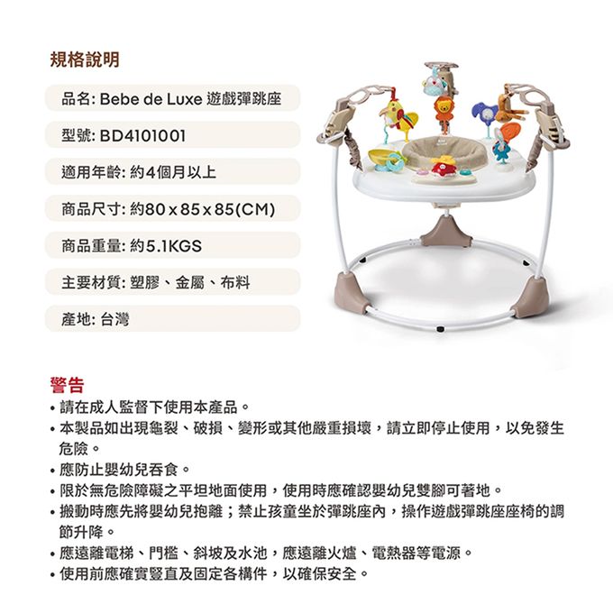 • 注意事項:適用年齡:約4個月以上 重量:約5.1kgs 展開尺寸:約80x85x85cm 主要材質:塑膠、金屬、布料 產地:台灣 BSMI許可字號:M35234 【注意事項】 ● 請在成人監督下使用本產品。 ● 本製品如出現龜裂、破損、變形或其他嚴重損壞,請立即停止使用,以免發生危險。 ● 應防止嬰幼兒吞食。 ● 限於無危險障礙之平坦地面使用,使用時應確認嬰幼兒雙腳可著地。 ● 搬動時應先將嬰幼兒抱離;禁止孩童坐於彈跳座內,操作遊戲彈跳座座椅的調節升降。 ● 應遠離電梯、門檻、斜坡及水池,應遠離火爐、電熱器等電源。 ● 使用前應確實豎直及固定各構件,以確保安全。