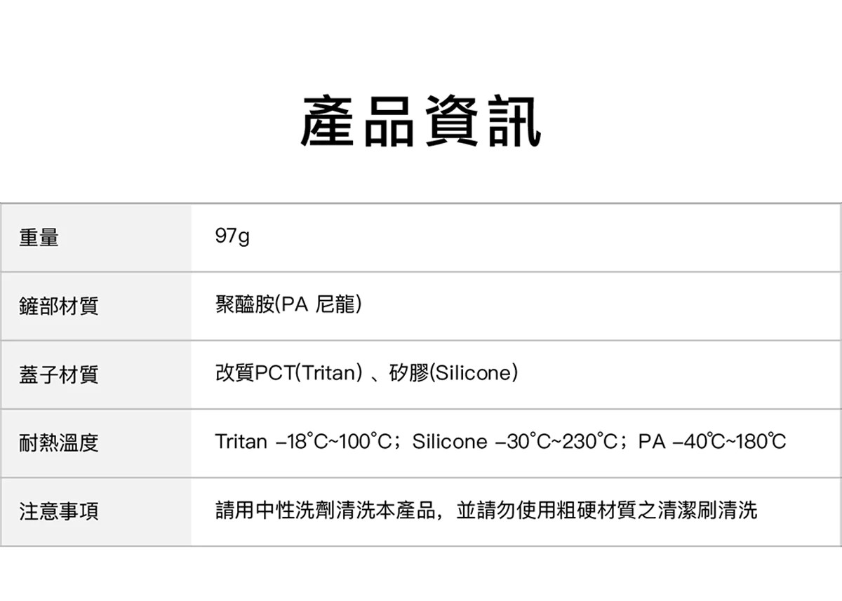 材質:鏟部-聚醯胺 (PA 尼龍);蓋子-Tritan+矽膠(Silicone)+