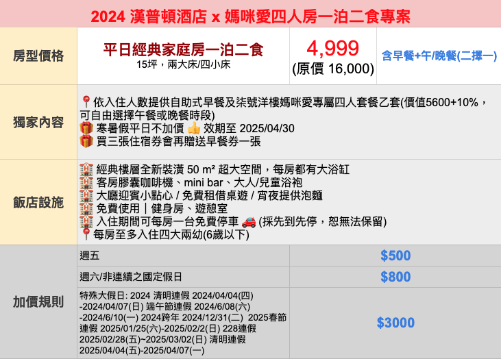 註 6:加人加價:兒童7-12歲加價每位$385含早&備品。請自行評估床鋪空間是否適合加人。