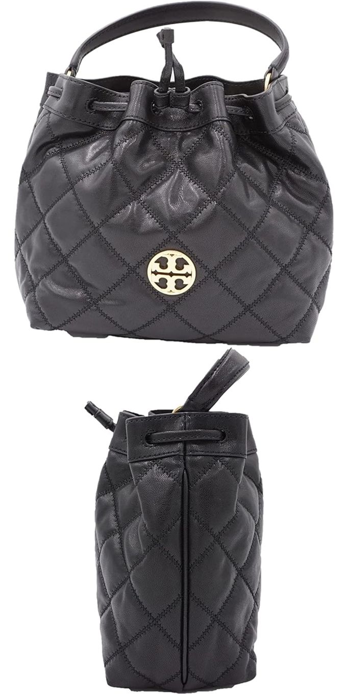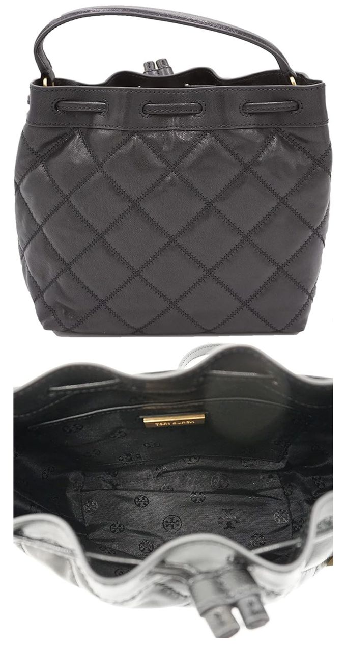 荾格紋皮革水桶包 (黑色)