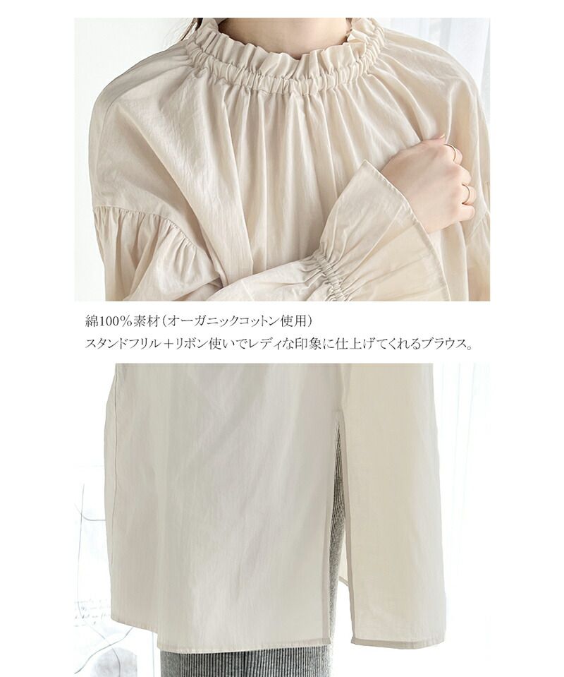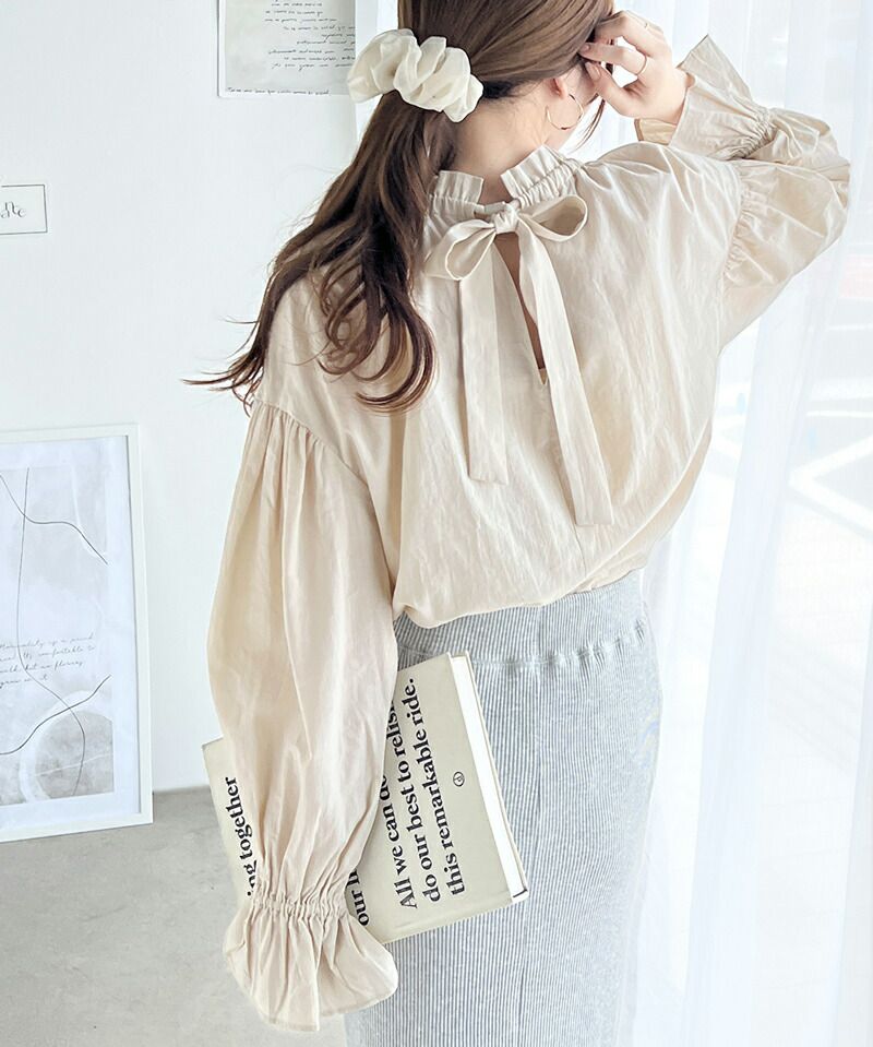 日本 Classical Elf - 2way糖果袖綁帶純棉長版上衣-淺卡其