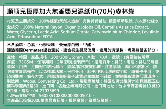 品名:極厚加大無香嬰兒濕巾(森林綠)11包(70抽)再送隨身包2包(20抽)