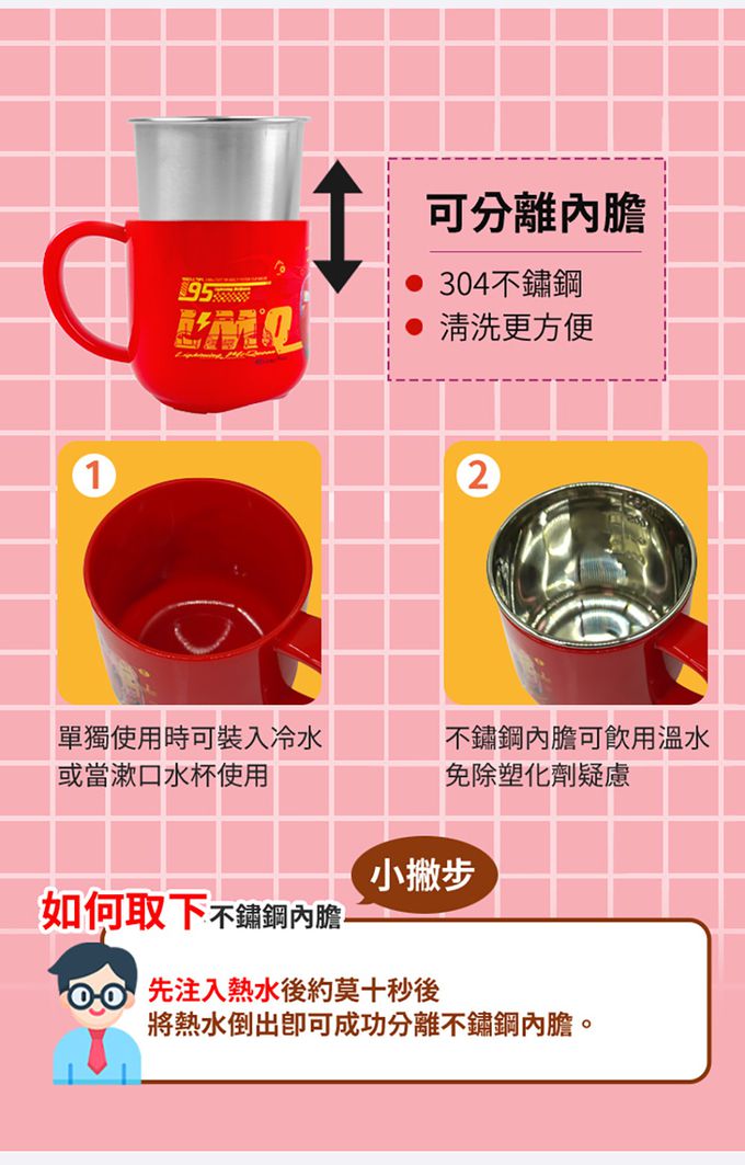 注意事項:●不鏽鋼內膽可單獨拆卸高溫消毒。杯身請勿使用洗碗機、'紫外線消毒鍋及煮沸等方式消毒,可能會導致產品變形或圖案剝落。 ●不鏽鋼製品請勿使用微波爐加熱。 ●內外膽可分離, 因密合度精準,首次拆卸加入些許熱水後倒出,可較輕易取出內膽。 ●本品無防漏,請勿橫置或劇烈搖晃避免飲品漏出。 ●不鏽鋼材質製程中皆會產生細微刮壓痕均屬正常現象。 ●請以柔軟海綿搭配中性洗潔劑及清水洗淨晾乾,請勿使用鋼刷等硬質物洗滌,避免產品刮傷。 ●勿讓孩童單獨使用,請在成人看護下使用。