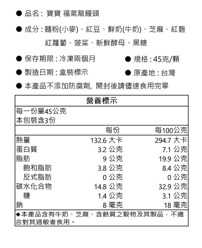 成分:麥粉(小麥)、紅豆、鮮奶(牛奶)、芝麻、紅麴、紅蘿蔔、菠菜、新鮮酵母、黑糖