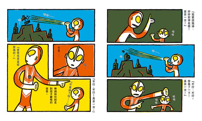 而這樣的時代經典,在宮西達也的生花妙筆中,超人力霸王和巴爾坦星人怪獸都多了一個身分──爸爸。