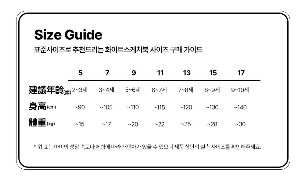 5[90cm]、7[91~105cm]、9[101~110cm]、11[106~115cm]、13[111~120cm]、15[121~130cm]、17[131~140cm]
